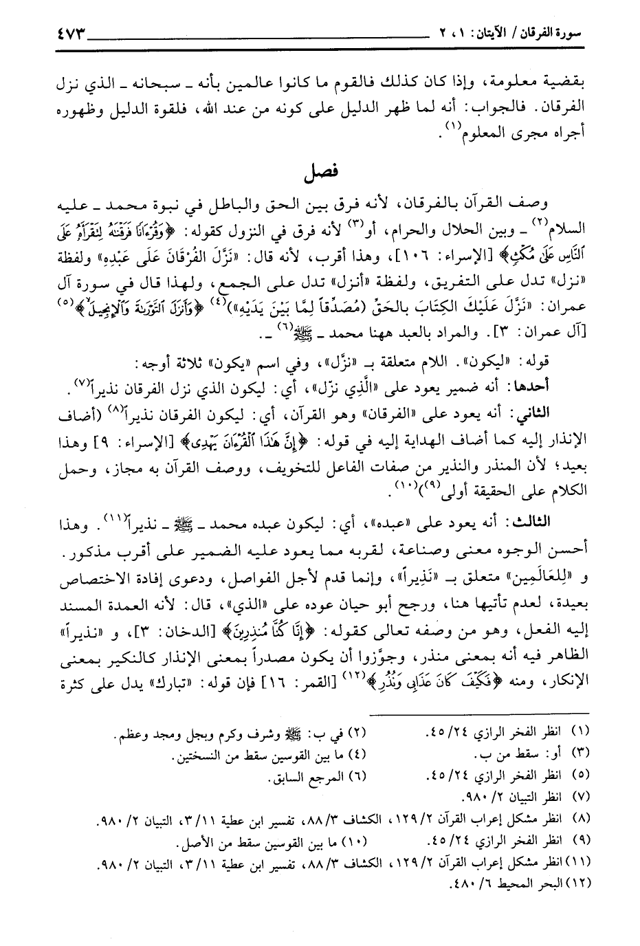 الثاني: أنه يعود على «الفرقان» وهو القرآن، أي: ليكون الفرقان نذيراً (أضاف الإنذار إليه كما أضاف الهداية إليه في قوله: {إِنَّ هذا القرآن يِهْدِي} [الإسراء: 9] وهذا بعيد؛ لأن المنذر والنذير من صفات الفاعل للتخويف، ووصف القرآن به مجاز، وحمل الكلام على الحقيقة أولى) .