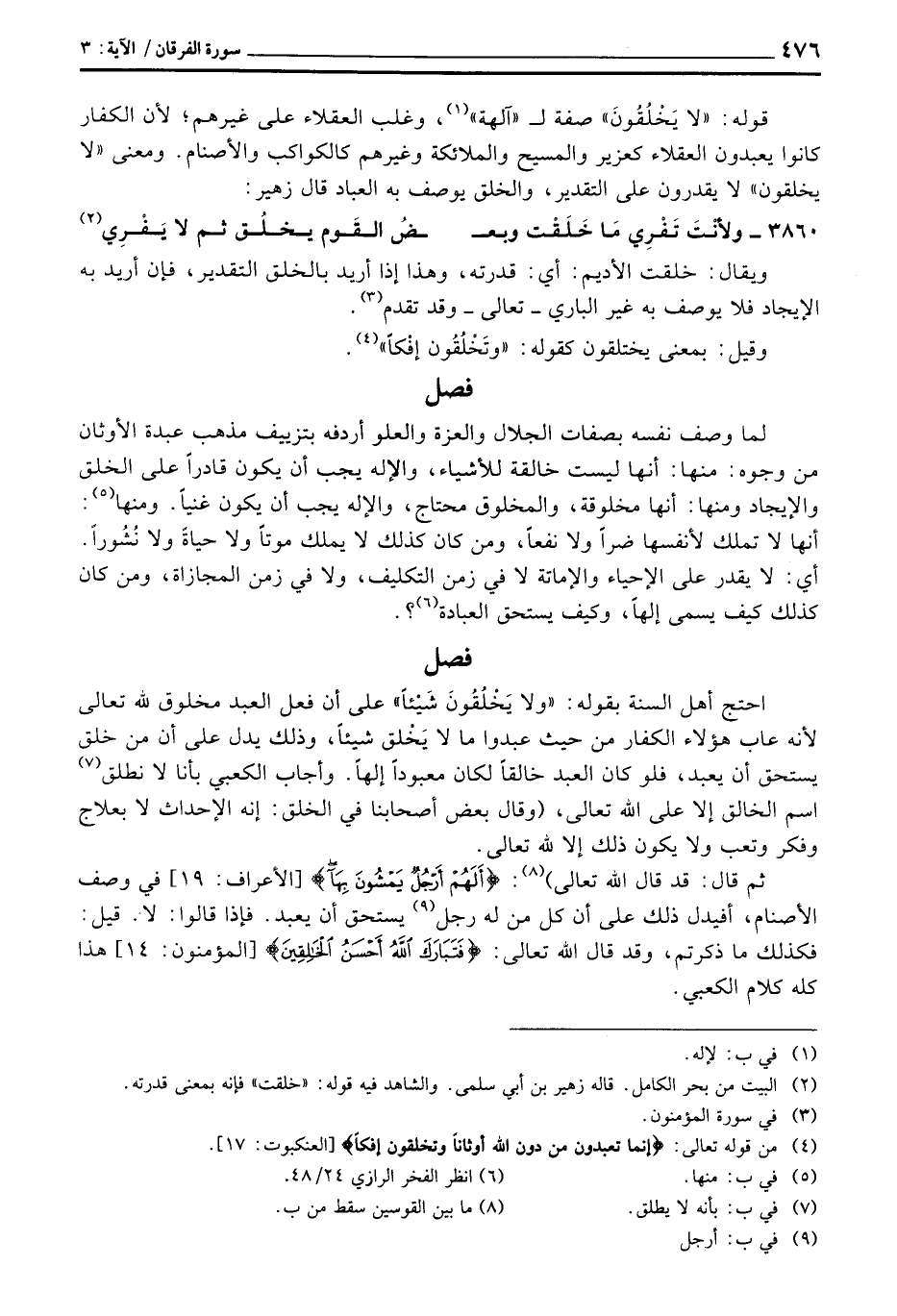 احتج أهل السنة بقوله: «ولا يَخْلُقُونَ شَيْئاً» على أن فعل العبد مخلوق لله تعالى لأنه عاب هؤلاء الكفار من حيث عبدوا ما لا يَخْلُق شيئاً، وذلك يدل على أن من خلق يستحق أن يعبد، فلو كان العبد خالقاً لكان معبوداً إلهاً. وأجاب الكعبي بأنا لا نطلق اسم الخالق إلا على الله تعالى، (وقال بعض أصحابنا في الخلق: إنه الإحداث لا بعلاج وفكر وتعب ولا يكون ذلك إلا لله تعالى.