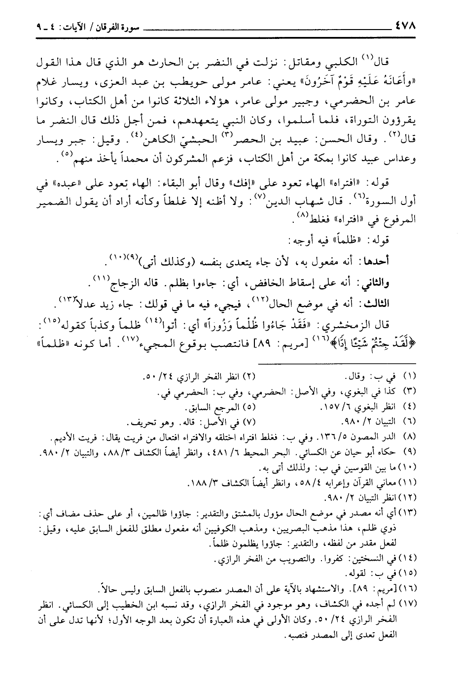 قال الزمخشري: {فَقَدْ جَآءُوا ظُلْماً وَزُوراً} أي: أتوا ظلماً وكذباً كقوله: {لَقَدْ جِئْتُمْ شَيْئاً إِدّاً} [مريم: 89] فانتصب بوقوع المجيء. أما كونه «ظلماً»