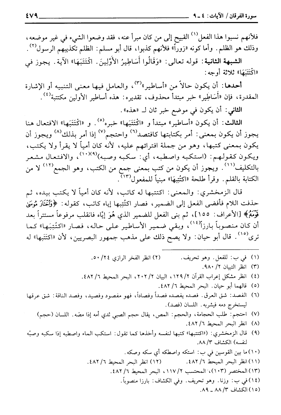 الشبهة الثانية: قوله تعالى: {وقالوا أَسَاطِيرُ الأولين. اكتتبها} الآية. يجوز في «اكْتَتَبَهَا» ثلاثة أوجه: