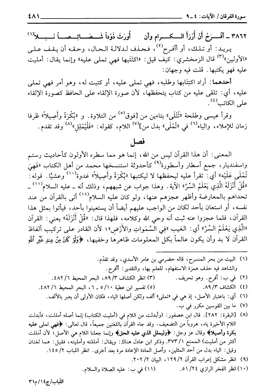 يريد: أو تلك، أو أأفرح، فحذف لدلالة الحال، وحقه أن يقف على «الأولين» قال الزمخشري: كيف قيل: {اكتَتَبها فهي تملى عليه} وإنما يقال: أمليت عليه فهو يكتبها. قلت فيه وجهان: