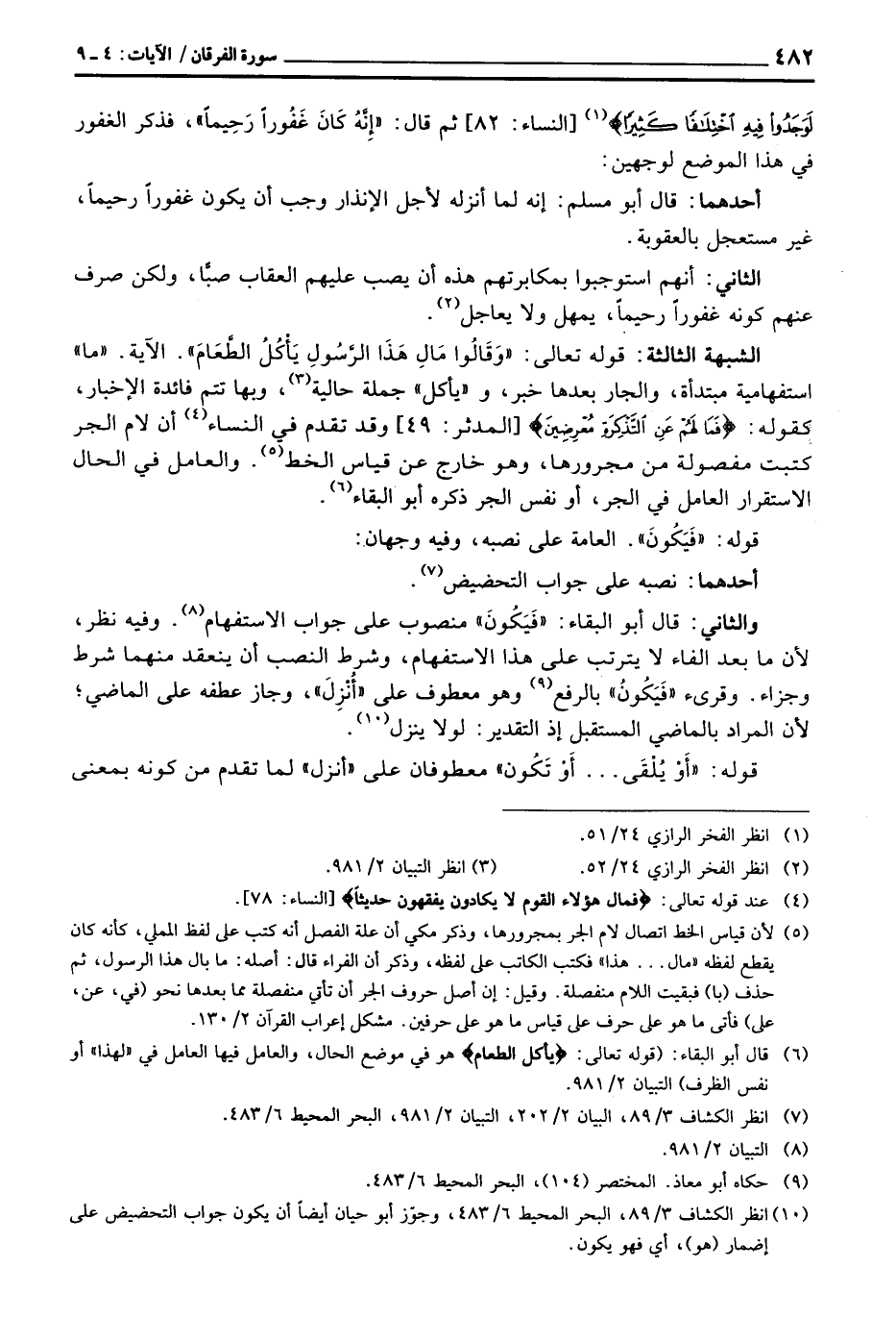 الشبهة الثالثة: قوله تعالى: {وَقَالُواْ مَالِ هذا الرسول يَأْكُلُ الطعام} . الآية. «ما» استفهامية مبتدأة، والجار بعدها خبر، و «يأكل» جملة حالية، وبها تتم فائدة الإخبار، كقوله: {فَمَا لَهُمْ عَنِ التذكرة مُعْرِضِينَ} [المدثر: 49] وقد تقدم في النساء أن لام الجر كتبت مفصولة من مجرورها، وهو خارج عن قياس الخط. والعامل في الحال الاستقرار العامل في الجر، أو نفس الجر ذكره أبو البقاء.