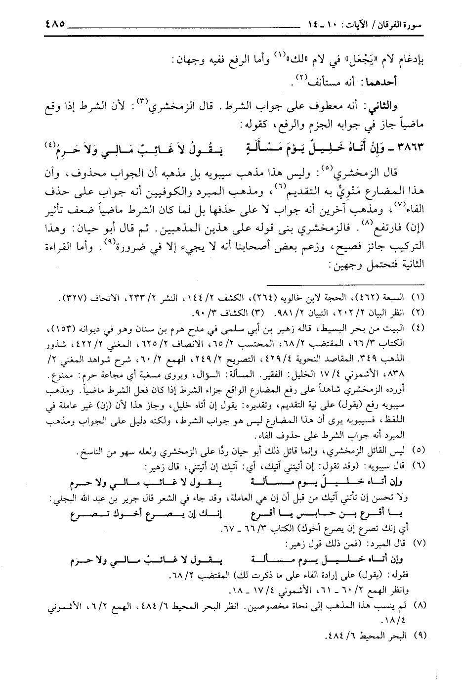 قال الزمخشري: وليس هذا مذهب سيبويه بل مذهبه أن الجواب محذوف، وأن هذا المضارع مَنْوِيٌّ به التقديم، ومذهب المبرد والكوفيين أنه جواب على حذف الفاء، ومذهب آخرين أنه جواب لا على حذفها بل لما كان الشرط ماضياً ضعف تأثير (إن) فارتفع. فالزمخشري بنى قوله على هذين المذهبين. ثم قال أبو حيان: وهذا التركيب جائز فصيح، وزعم بعض أصحابنا أنه لا يجيء إلا في ضرورة. وأما القراءة الثانية فتحتمل وجهين:
