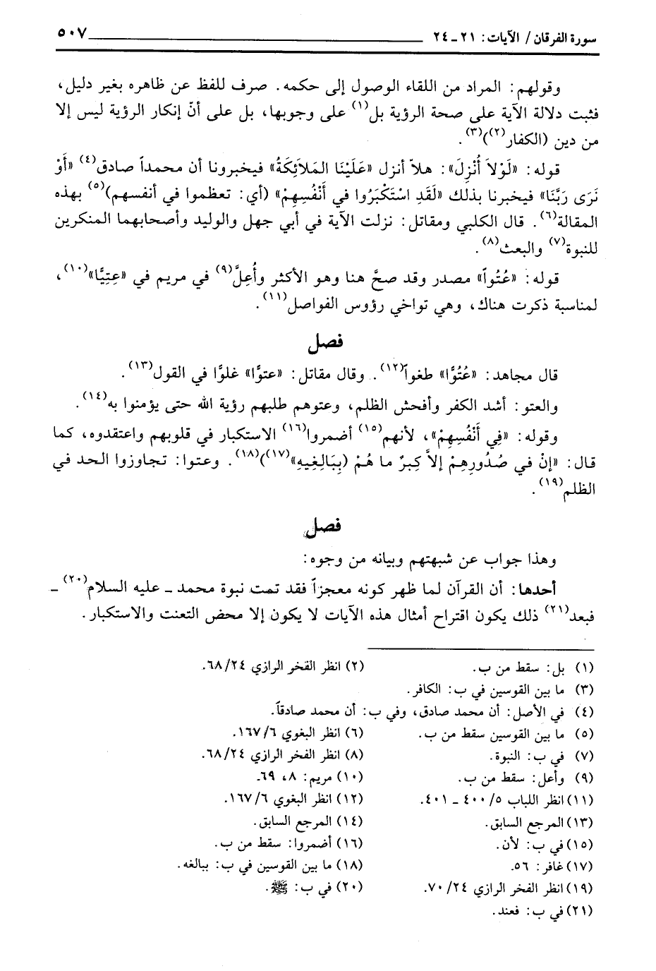 قوله: «لَوْلاَ أُنْزِلَ» : هلاّ أنزل «عَلَيْنَا المَلاَئِكَةُ» فيخبرونا أن محمداً صادق {أَوْ نرى رَبَّنَا} فيخبرنا بذلك {لَقَدِ استكبروا في أَنفُسِهِمْ} (أي: تعظموا في أنفسهم) بهذه المقالة.