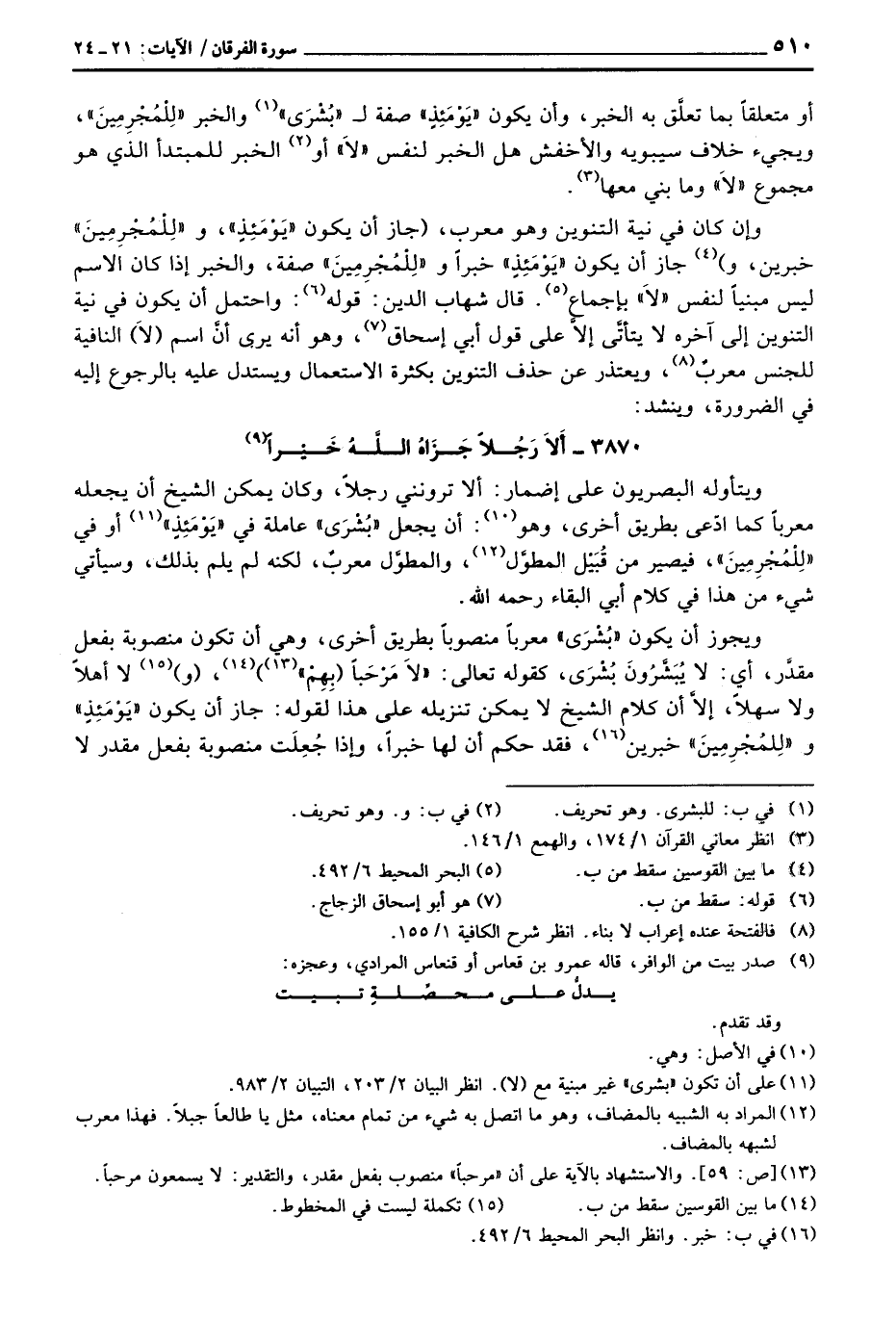 3870 - أَلاَ رَجُلاً جَزَاهُ اللَّهُ خَيْراً ... ويتأوله البصريون على إضمار: ألا ترونني رجلاً، وكان يمكن الشيخ أن يجعله معرباً كما ادّعى بطريق أخرى، وهو: أن يجعل «بُشْرَى» عاملة في «يَوْمَئِذٍ» أو في «لِلْمُجْرِمِينَ» ، فيصير من قُبَيْل المطوَّل، والمطوَّل معربٌ، لكنه لم يلم بذلك، وسيأتي شيء من هذا في كلام أبي البقاء رَحِمَهُ اللَّهُ.