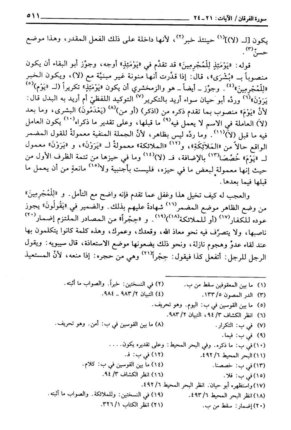 والعجب له كيف تخيل هذا وغفل عما تقدم فإنه واضح مع التأمل. و «لِلْمُجْرِمِينَ» من وضع الظاهر موضع المضمر شهادةً عليهم بذلك. والضمير في «يقُولُونَ» يجوز عوده للكفار (أو للملائكة) . و «حِجْراً» من المصادر الملتزم إضمار ناصبها، ولا يتصرَّف فيه نحو معاذ الله، وقعدك، وعمرك، وهذه كلمة كانوا يتكلمون بها عند لقاء عدوٍّ وهجوم نازلة، ونحو ذلك يضعونها موضع الاستعاذة، قال سيبويه: ويقول الرجل للرجل: أتفعل كذا فيقول: حِجْراً وهي من حجره: إذا منعه، لأنَّ المستعيذ