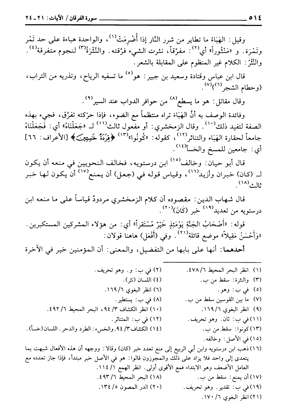 وقيل: الهَبَاءُ ما تطاير من شرر النَّار إذا أُضْرِمَتْ، والواحدة هباءة على حد تَمْر وتَمْرَة. و «مَنْثُوراً» أي: مفرَّقاً، نثرت الشيء فرَّقته. والنَّثْرَةُ لنجوم متفرقة. والنَّثْرُ: الكلام غير المنظوم على المقابلة بالشعر.