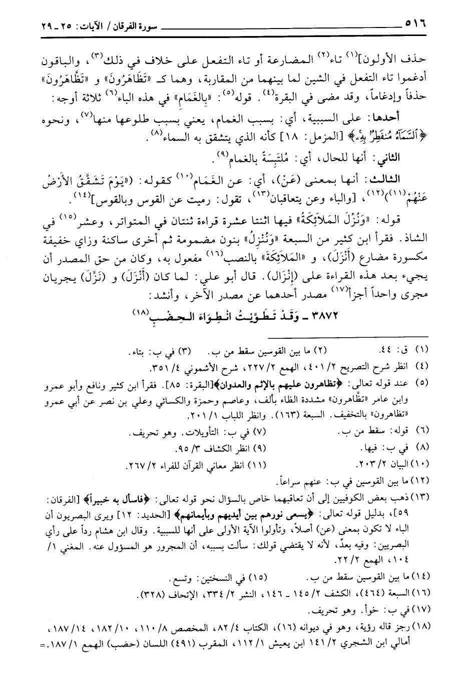 حذف الأولون] تاء المضارعة أو تاء التفعل على خلاف في ذلك، والباقون أدغموا تاء التفعل في الشين لما بينهما من المقاربة، وهما ك «تَظَاهَرُونَ» و «تَظَّاهَرُونَ» حذفاً وإدغاماً، وقد مضى في البقرة. قوله: «بِالغَمَامِ» في هذه الباء ثلاثة أوجه: