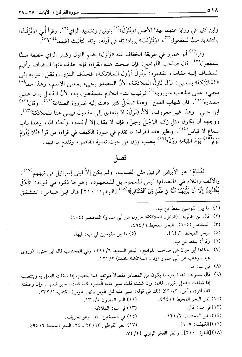 وقرأ أبو عمرو في طريقة الخفاف عنه «وَنُزِلَ» بضم النون وكسر الزاي خفيفة مبنيًّا للمفعول. قال صاحب اللوامح: فإن صحت هذه القراءة فإنه حذف منها المضاف وأقيم المضاف إليه مقامه، تقديره: ونُزِلَ نُزُول الملائكة، فحذف النزول ونقل إعرابه إلى «المَلاَئِكَة» بمعنى: نَزَلَ نَازِلُ الملائكة، لأنَّ المصدر يجيء بمعنى الاسم، وهذا مما يجيء على مذهب سيبويه ترتيب بناء اللازم للمفعول به، لأنَّ الفعل يدل على مصدره. قال شهاب الدين: وهذا تمحُّلٌ كثير دعت إليه ضرورة الصناعة. وقال ابن جني: وهذا غير معروف، لأنَّ (نَزَلَ) لا يتعدى إلى مفعول فيبنى هنا للملائكة، ووجهه أن يكون مثل زكم الرَّجُلُ وجنَّ، فإنه لا يقال إلا أزكمه، وأجنّه الله، وهذا باب سماع لا قياس. ونظير هذه القراءة ما تقدم في سورة الكهف في قراءة من قرأ {فَلاَ يَقُومُ لَهُمْ يَوْمَ القِيَامَةِ وَزْناً} بنصب الوزن من حيث تعدية القاصر، وتقدم ما فيها.