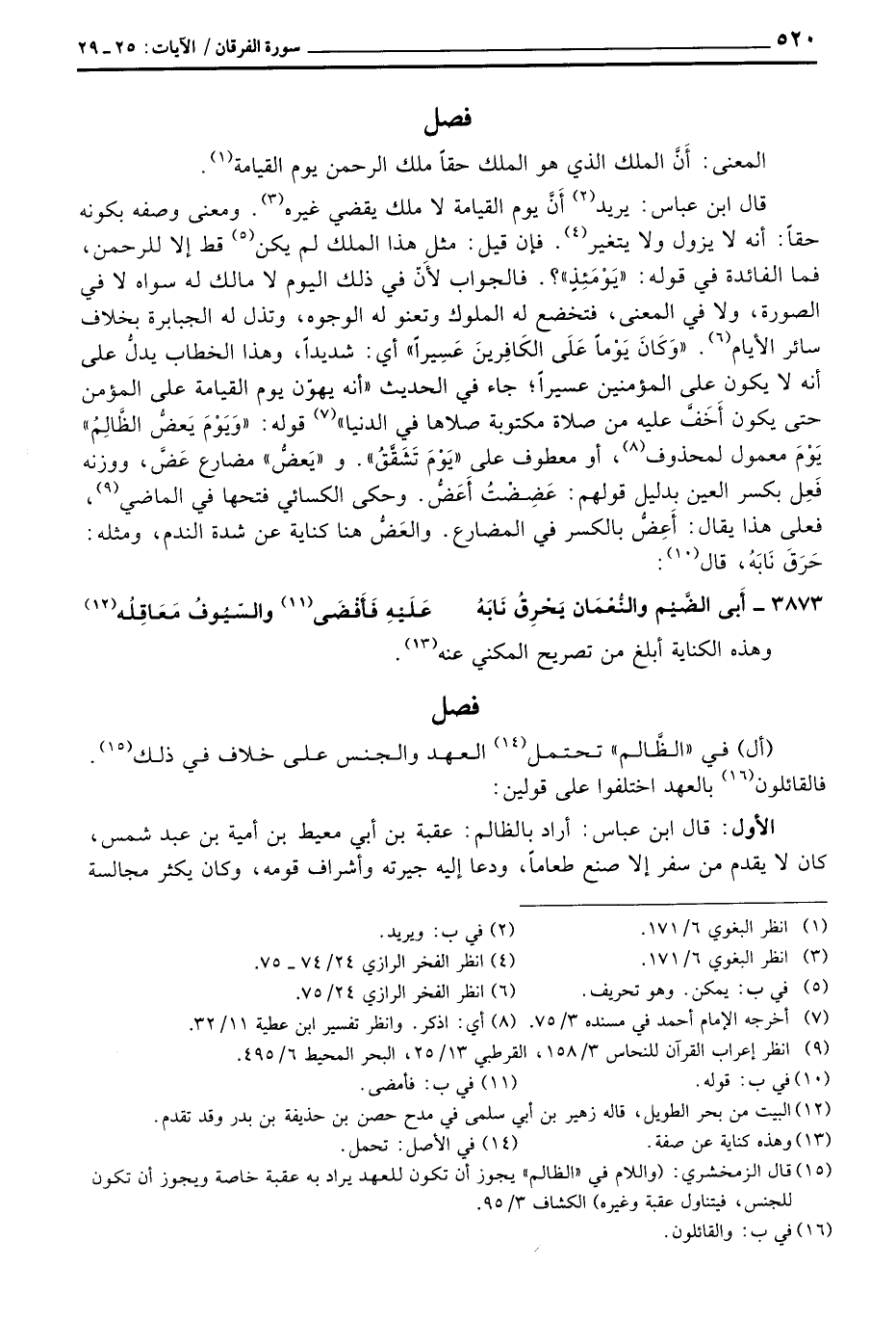 قال ابن عباس: يريد أَنَّ يوم القيامة لا ملك يقضي غيره. ومعنى وصفه بكونه حقاً: أنه لا يزول ولا يتغير. فإن قيل: مثل هذا الملك لم يكن قط إلا للرحمن، فما الفائدة في قوله: «يَوْمَئِذٍ» ؟ . فالجواب لأَنّ في ذلك اليوم لا مالك له سواه لا في الصورة، ولا في المعنى، فتخضع له الملوك وتعنو له الوجوه، وتذل له الجبابرة بخلاف سائر الأيام. {وَكَانَ يَوْماً عَلَى الكافرين عَسِيراً} أي: شديداً، وهذا الخطاب يدلُّ على أنه لا يكون على المؤمنين عسيراً؛ جاء في الحديث «أنه يهوّن يوم القيامة على المؤمن حتى يكون أَخَفَّ عليه من صلاة مكتوبة صلاها في الدنيا» قوله: {وَيَوْمَ يَعَضُّ الظالم} يَوْمَ معمول لمحذوف، أو معطوف على «يَوْمَ تَشَقَّقُ» . و «يَعضُّ» مضارع عَضَّ، ووزنه فَعِل بكسر العين بدليل قولهم: عَضِضْتُ أَعَضُّ. وحكى الكسائي فتحها في الماضي، فعلى هذا يقال: أَعِضُّ بالكسر في المضارع. والعَضُّ هنا كناية عن شدة الندم، ومثله: حَرَقَ نَابَهُ، قال: