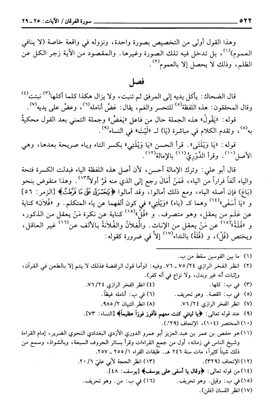 قال أبو علي: وترك الإمالة أحسن، لأن أصل هذه اللفظة الياء فبدلت الكسرة فتحة والياء ألفاً فراراً من الياء، فَمَنْ أَمَالَ رجع إلى الذي منه فَرَّ أولاً. وهذا منقوض بنحو (بَاعَ) فإن أصله الياء، ومع ذلك أمالوا، وقد أمالوا {ياحسرتا على مَا فَرَّطَتُ} [الزمر: 56] و «يَا أَسَفَى» وهما ك (ياء) «وَيْلَتِي» في كون ألفهما عن ياء المتكلم. و «فُلاَن» كناية عن عَلَمِ من يعقل، وهو متصرف. و «فُلُ» كناية عن نكرة مَنْ يعقل من الذكور، و «فُلَةُ» عن مَنْ يعقل من الإناث. والفُلاَنُ والفُلاَنةُ بالألف عن غير العاقل، ويختص (فُلُ) ، و (فُلَةُ) بالنداء إلاَّ في ضرورة كقوله: