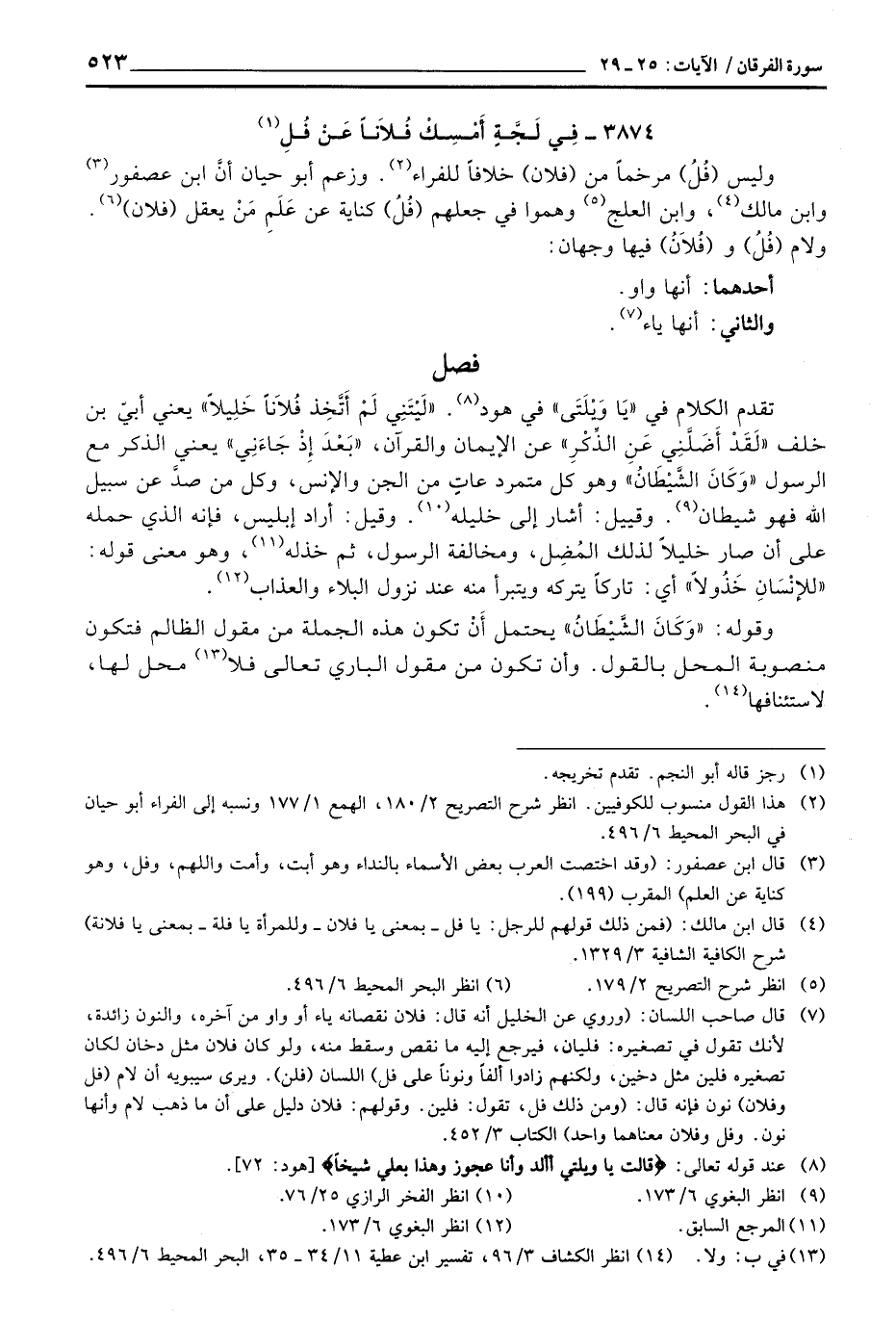 3874 - فِي لَجَّةٍ أَمْسِكْ فُلاَناً عَنْ فُلِ ... وليس (فُلُ) مرخماً من (فلان) خلافاً للفراء. وزعم أبو حيان أنَّ ابن عصفور وابن مالك، وابن العلج وهموا في جعلهم (فُلُ) كناية عن عَلَمِ مَنْ يعقل (فلان) . ولام (فُلُ) و (فُلاَنُ) فيها وجهان:
