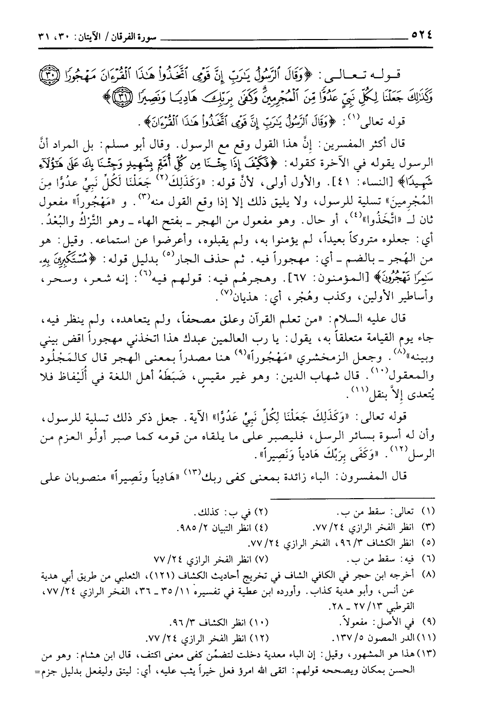 قال أكثر المفسرين: إنَّ هذا القول وقع مع الرسول. وقال أبو مسلم: بل المراد أنَّ الرسول يقوله في الآخرة كقوله: {فَكَيْفَ إِذَا جِئْنَا مِن كُلِّ أمَّةٍ بِشَهِيدٍ وَجِئْنَا بِكَ على هؤلاء شَهِيداً} [النساء: 41] . والأول أولى، لأنَّ قوله: {وَكَذَلِكَ جَعَلْنَا لِكُلِّ نَبِيٍّ عَدُوّاً مِّنَ المجرمين} تسلية للرسول، ولا يليق ذلك إلا إذا وقع القول منه. و «مَهْجُوراً» مفعول ثان ل «اتَّخَذُوا» ، أو حال. وهو مفعول من الهجر - بفتح الهاء - وهو التَّرْكُ والبُعْدُ. أي: جعلوه متروكاً بعيداً، لم يؤمنوا به، ولم يقبلوه، وأعرضوا عن استماعه. وقيل: هو من الهُجر - بالضم - أي: مهجوراً فيه. ثم حذف الجار بدليل قوله: {مُسْتَكْبِرِينَ بِهِ سَامِراً تَهْجُرُونَ} [المؤمنون: 67] . وهجرهُم فيه: قولهم فيه: إنه شعر، وسحر، وأساطير الأولين، وكذب وهُجْر، أي: هذيان.