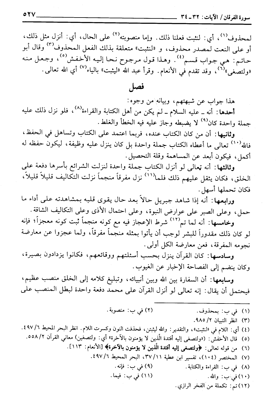 وخامسها: أنه لما تم شرط الإعجاز فيه مع كونه منجماً ثبت كونه معجزاً؛ فإنه لو كان ذلك مقدوراً للبشر لوجب أن يأتوا بمثله منجماً مفرقاً، ولما عجزوا عن معارضة نجومه المفرقة، فعن معارضة الكل أولى.
