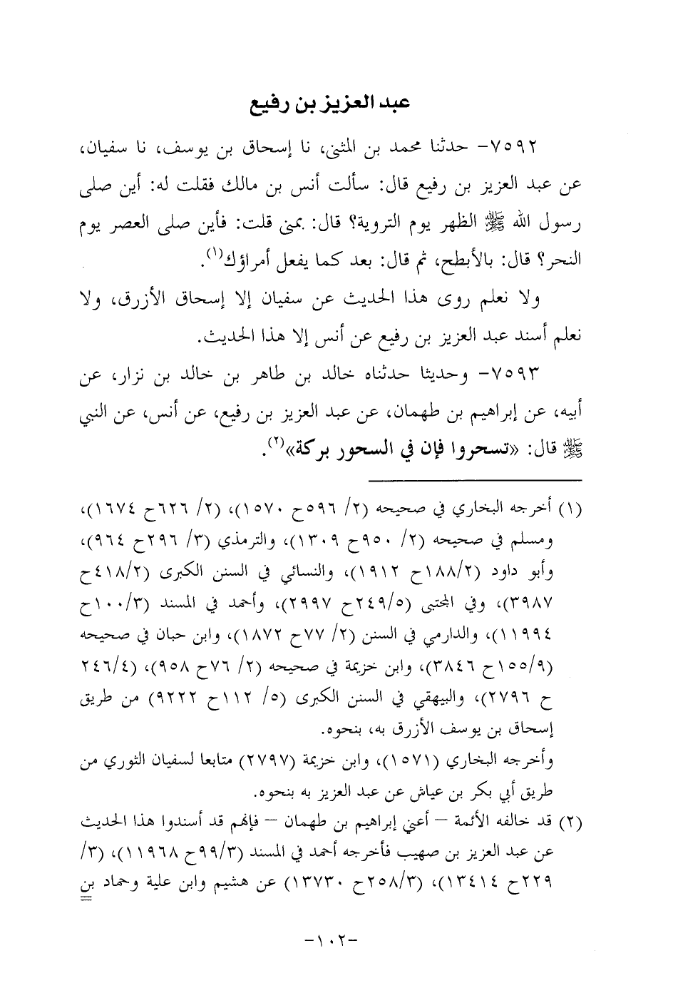 7593- وحديثا حَدَّثناه خالد بن طاهر بن خالد بن نزار، عَن أَبِيه عن إبراهيم بن طهمان عن عَبد العزيز بن رفيع، عَن أَنَس، عَن النَّبِيّ صَلَّى اللَّهُ عَلَيه وَسَلَّم قَالَ: تَسَحَّرُوا فَإِنَّ فِي السَّحُورِ بَرَكَةً.