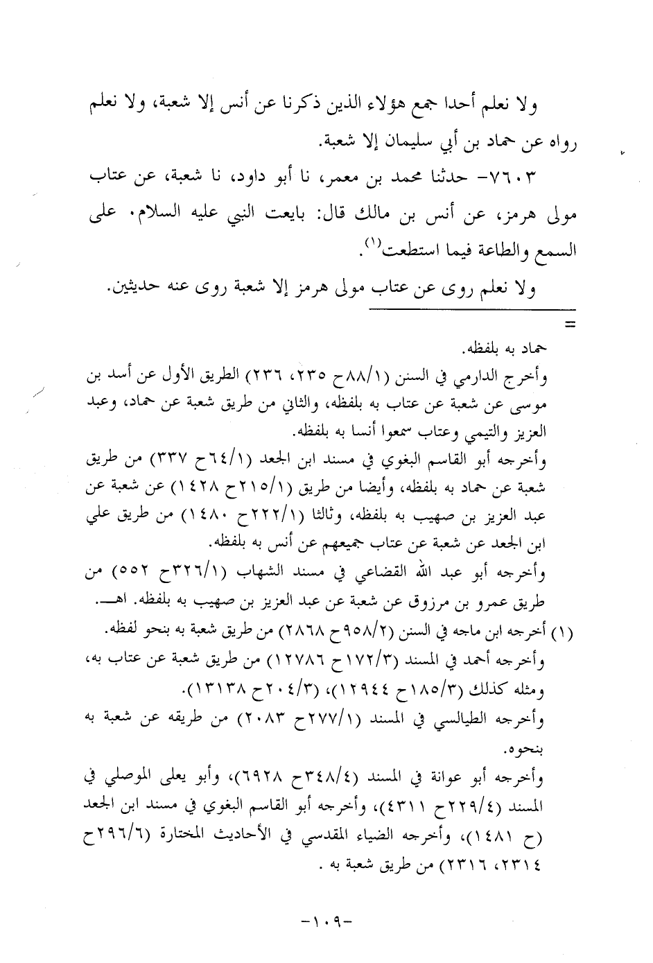 7603- حَدَّثنا مُحَمد بن مَعْمَر، حَدَّثنا أَبُو داود، حَدَّثنا شُعْبَةُ، عَن عتاب مولى هرمز، عَن أَنَس بن مالك قال: بايعت النَّبِيّ عليه السلام على السمع والطاعة فيما استطعت.