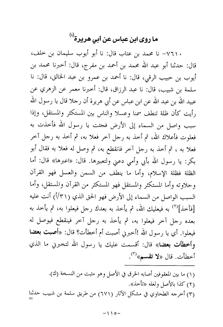 7610- حَدَّثنا مُحَمد بن عتاب، قَال: حَدَّثنا أَبُو أيوب سُلَيْمان بن خلف، قَال: حَدَّثنا أَبُو عَبد الله مُحَمد بن أحمد بن مفرج، قال: أَخْبَرنا مُحَمد بْنُ أَيُّوبَ بْنِ حَبِيبٍ الرَّقِّيُّ، قَال: حَدَّثنا أَحْمَدُ بْنُ عَمْرو بْنِ عَبد الْخَالِقِ، قَال: حَدَّثنا سلمة بن شَبِيب، قَال: حَدَّثنا عَبد الرزاق، قال: أَخْبَرنا مَعْمَر، عَن الزُّهْرِيّ عَنْ عُبَيد اللَّهِ بْنِ عَبد الله، عَن ابن عباس، عَن أبي هُرَيرة؛ أن رجلاً قال يا رَسولَ اللهِ رأيت كأن ظلة تنطف سمنا وعسلا والناس بين المستكثر والمستقل، وإذا سبب واصل من السماء إلى الأرض فجئت يا رَسولَ اللهِ فأخذت به فعلوت فأعلاك الله، ثُمَّ أخذ به رجل آخر فعلا به، ثُمَّ أخذ به رجل آخر فعلا به، ثُمَّ أخذ به رجل آخر فانقطع به، ثُمَّ وصل له فعلا به.