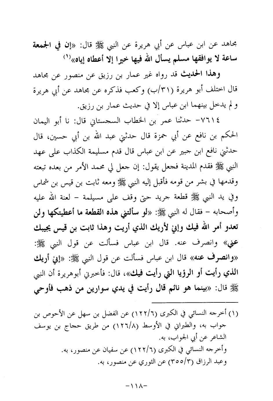 7614- حَدَّثنا عُمَر بن الخطاب السجستاني، قَال: حَدَّثنا أَبُو اليمان الحكم بن نافع، عَن أبي حمزة، قَال: حَدَّثني عَبد الله بن أبي حسين، قَال: حَدَّثني نافع بن جُبَير، عَن ابن عباس قال قدم مسيلمة الكذاب على عهد النَّبِيّ صَلَّى الله عَلَيه وَسَلَّم فقدم المدينة فجعل يقول: إن جعل لي مُحَمد الأمر من بعده تبعته، وقدمها في بشر من قومه، فأقبل إليه النَّبِيّ صَلَّى الله عَلَيه وَسَلَّم، ومعه ثابت بن قيس بن شماس، وفي يد النَّبِيّ صَلَّى الله عَلَيه وَسَلَّم قطعة جريد حتى وقف على مُسيلمة، لعنةُ الله عليه، وأصحابِهِ، فَقَالَ لَهُ النَّبِيّ صَلَّى اللَّهُ عَلَيه وَسَلَّم: لو سألتني هذه القطعة ما أعطيتكها، ولن تعدو أمر الله فيك، وَإِنِّي لأريكَ الَّذِي أُرِيتُ، وهذا ثابت بن قيس يجيبك عني، وانصرف عنه.