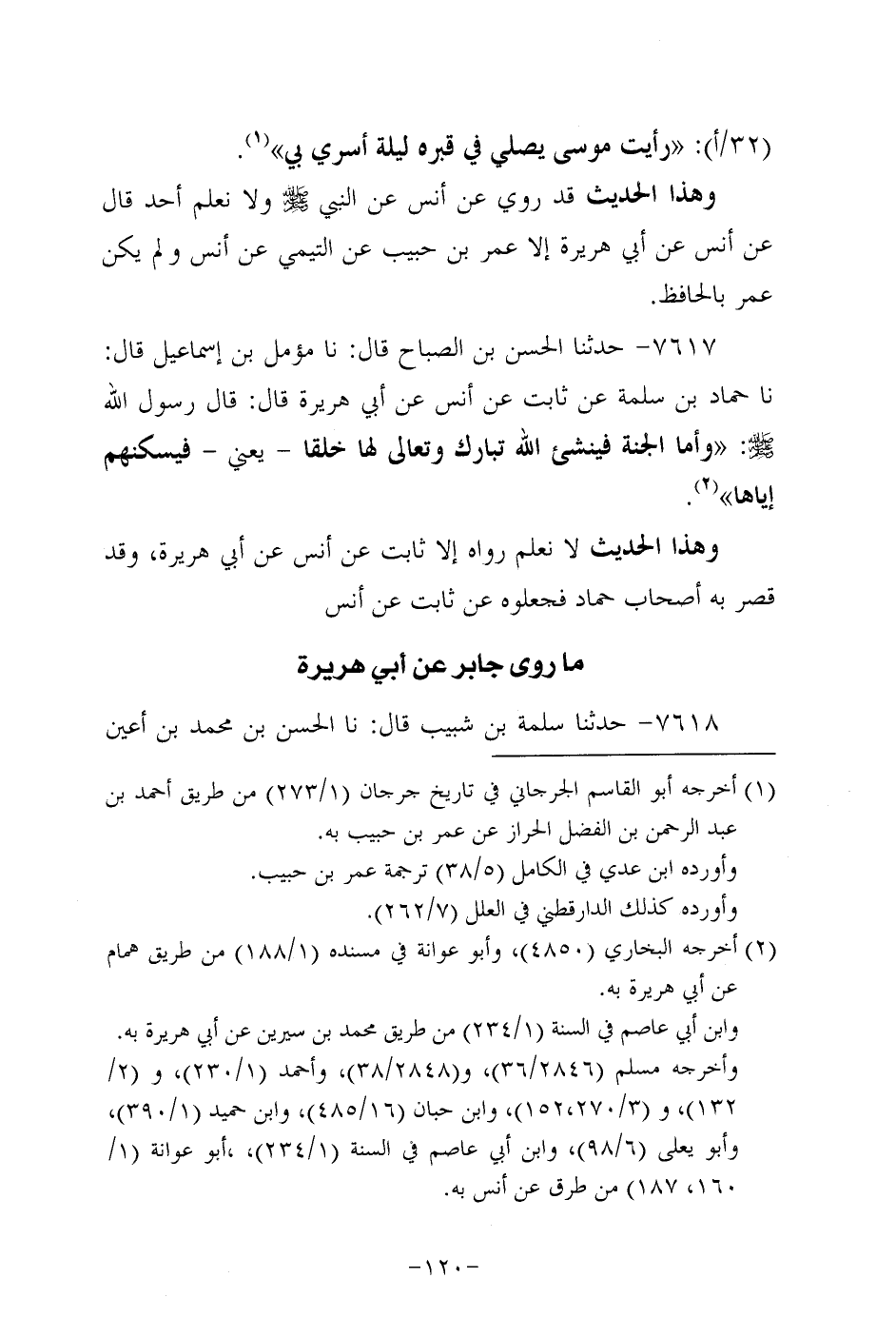 7617- حَدَّثنا الحسن بن الصَبَّاح، قَال: حَدَّثنا مُؤَمَّل بن إسماعيل، قَال: حَدَّثنا حَمَّادِ بْنِ سَلَمَةَ، عَنْ ثابتٍ، عَن أَنَس، عَن أبي هُرَيرة، قَالَ: قَالَ رَسُول اللهِ صَلَّى اللَّهُ عَلَيه وَسَلَّم: وأما الجنة فينشيء الله تبارك وتعالى لها خلقا - يعني فيسكنهم إياها.