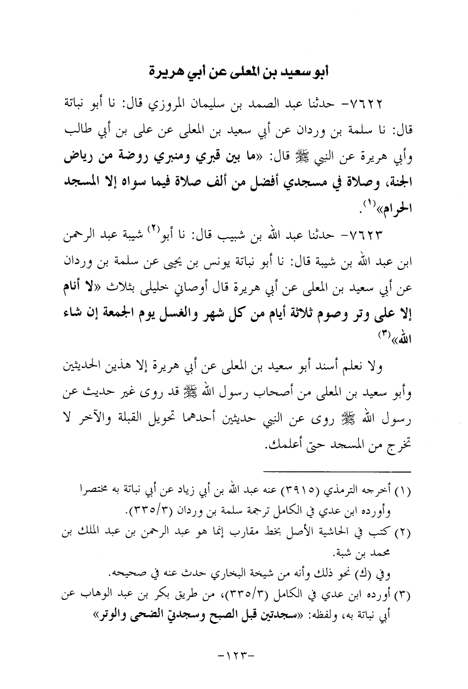 7623- حَدَّثنا عَبد الله بن شَبِيب، قَال: حَدَّثنا أَبُو شيبة عَبد الرحمن بن عَبد الله بن شيبة، قَال: حَدَّثنا أَبُو نباته يُونُس بن يحيى عن سلمة بن وردان، عَن أبي سَعِيد بن المعلى، عَن أبي هُرَيرة، قال أوصاني خليلي بثلاث لا أنام إلاَّ على وتر وصوم ثلاثة أيام من كل شهر والغسل يوم الجمعة إن شاء الله.