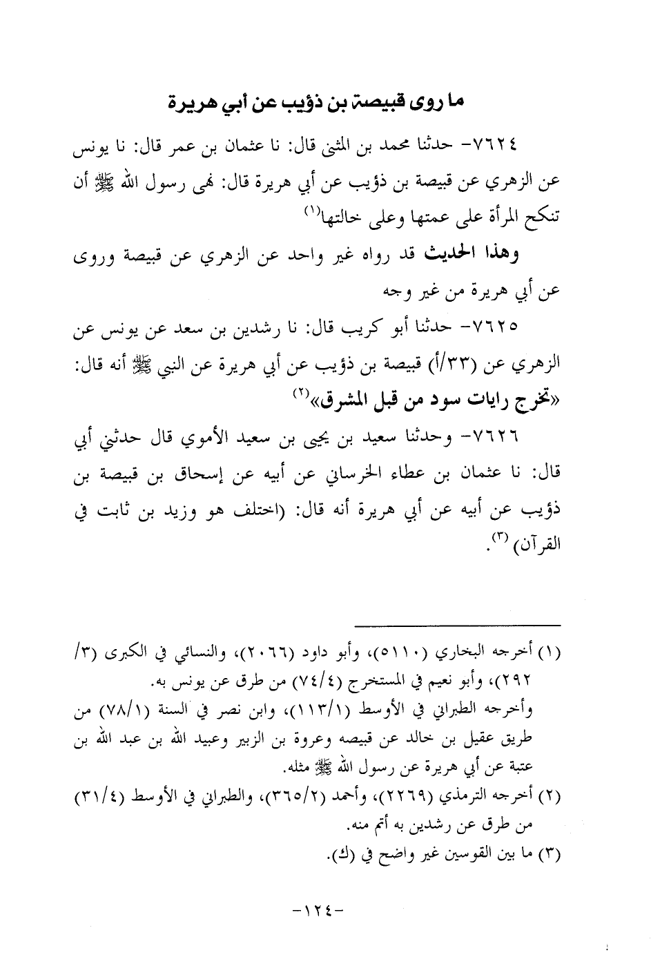 7625- حَدَّثنا أَبُو كُرَيب، قَال: حَدَّثنا رشدين بن سَعْد عن يُونُس، عَن الزُّهْرِيّ، عَن قَبِيصَة بن ذؤيب، عَن أَبِي هُرَيرة، عَن النَّبِيّ صَلَّى اللَّهُ عَلَيه وَسَلَّم؛ أَنَّه قال: تخرج رايات سود من قبل المشرق.