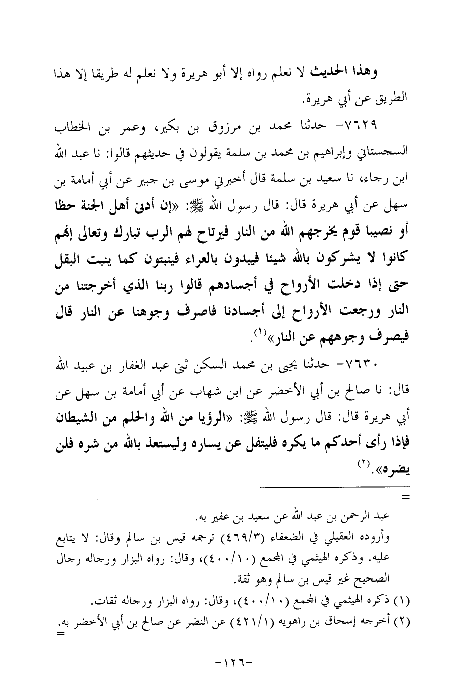 7629- حَدَّثنا مُحَمد بن مرزوق بن بكير وعمر بن الخطاب السجستاني وإبراهيم بن مُحَمد بن سلمة يقولون في حديثهم قالوا: حَدَّثنا عَبد الله بن رجاء، حَدَّثنا سَعِيد بن سلمة قال أخبرني موسى بن جُبَير، عَن أبي أُمَامَة بن سَهْل، عَن أبي هُرَيرة، قَالَ: قَالَ رَسُول اللهِ صَلَّى اللَّهُ عَلَيه وَسَلَّم: إن أدنى أهل الجنة حظا، أو نصيبا قوم يخرجهم الله من النار فيرتاح لهم الرب تبارك وتعالى إنهم كانوا لا يشركون بالله شيئا فيبدون بالعراء فينبتون كما ينبت البقل حتى إذا دخلت الأرواح في أجسادهم قالوا ربنا الذي أخرجتنا من النار ورجعت الأرواح إلى أجسادنا فاصرف وجوهنا عن النار قال فيصرف وجوههم عن النار.