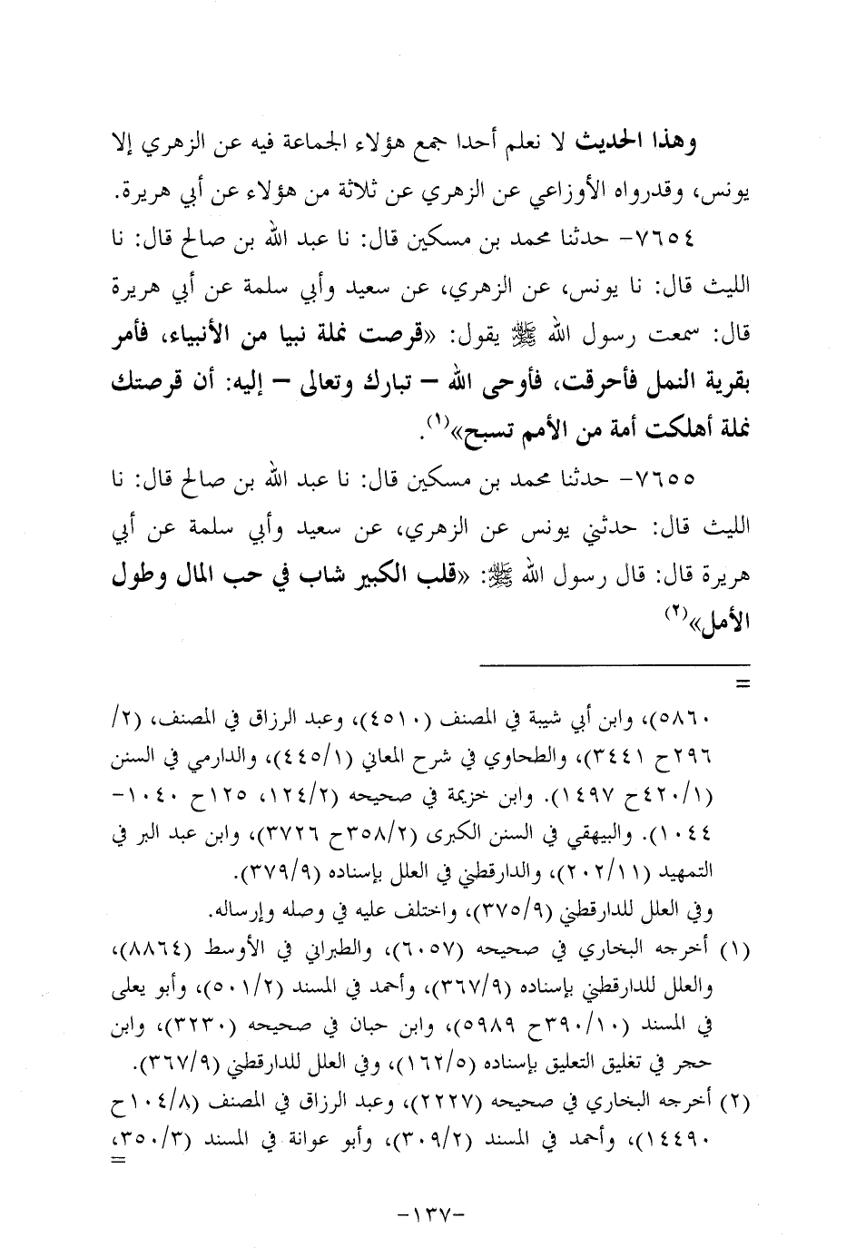 7655- حَدَّثنا مُحَمد بن مسكين، قَال: حَدَّثنا عَبد الله بن صالح، قَال: حَدَّثنا اللَّيْث قال: حدثني يُونُس، عَن الزُّهْرِيّ، عَن سَعِيد، وَأَبي سَلَمة، عَن أبي هُرَيرة، قَالَ: قَالَ رَسُول اللهِ صَلَّى اللَّهُ عَلَيه وَسَلَّم: قلب الكبير شاب في حب المال وطول الأمل.