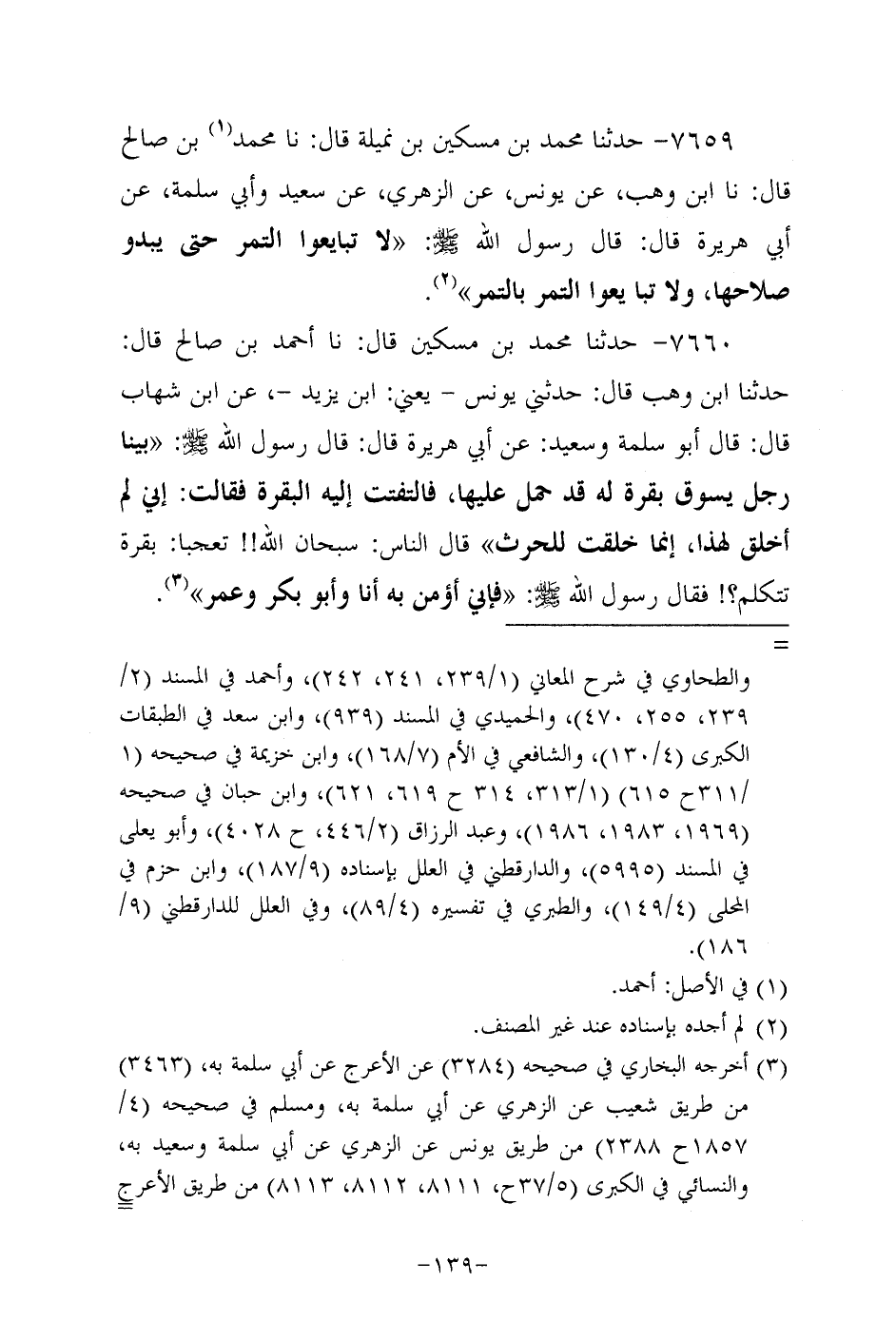 7660- حَدَّثنا مُحَمد بن مسكين، قَال: حَدَّثنا أحمد بن صالح، قَال: حَدَّثنا ابن وهب قال: حدثني يُونُس - يعني ابن يزيد - عَن ابن شِهاب قال: قال أَبُو سلمة وسعيد، عَن أبي هُرَيرة، قَالَ: قَالَ رَسُول اللهِ صَلَّى اللَّهُ عَلَيه وَسَلَّم: بينا رجل يسوق بقرة له قد حمل عليها فالتفتت إليه البقرة فقالت: إني لم أخلق لهذا إنما خلقت للحرث قال الناس: سبحان الله!! تعجبا: بقرة تتكلم؟ ! فَقَالَ رَسُولُ اللَّهِ صَلَّى اللَّهُ عَلَيه وَسَلَّم: فإني أؤمن به أنا، وَأبُو بكر وعمر.