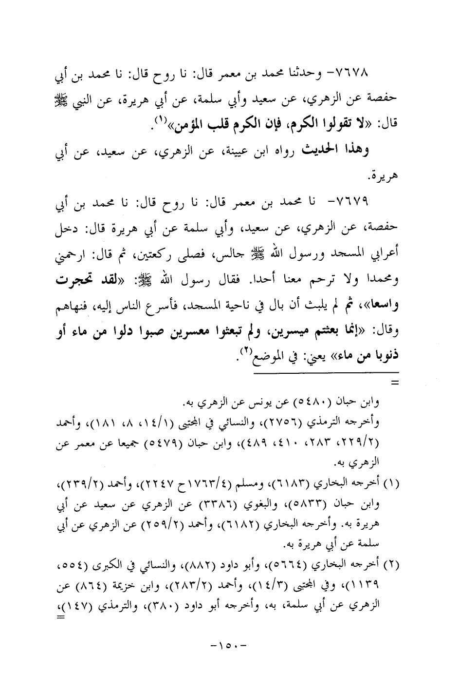 7679- حَدَّثنا مُحَمد بن مَعْمَر، قَال: حَدَّثنا روح، قَال: حَدَّثنا مُحَمد بْنُ أَبِي حَفْصَةَ، عَن الزُّهْرِيّ، عَن سَعِيد، وَأَبي سَلَمة، عَن أبي هُرَيرة قال: دخل أعرابي الْمَسْجِدَ وَرَسُولُ اللَّهِ صَلَّى اللَّهُ عَلَيه وَسَلَّم جالس فصلى ركعتين، ثُمَّ قال: ارحمني ومحمدا، ولاَ ترحم معنا أَحَدًا. فَقَالَ رَسُولُ اللَّهِ صَلَّى اللَّهُ عَلَيه وَسَلَّم: لقد تحجرت واسعا، ثُمَّ لم يلبث أن بال في ناحية المسجد فأسرع الناس إليه فنهاهم، وَقال: إنما بعثم ميسرين ولم تبعثوا معسرين صبوا دلوا من ماء، أو ذنوبا من ماء، يعني: في الموضع.