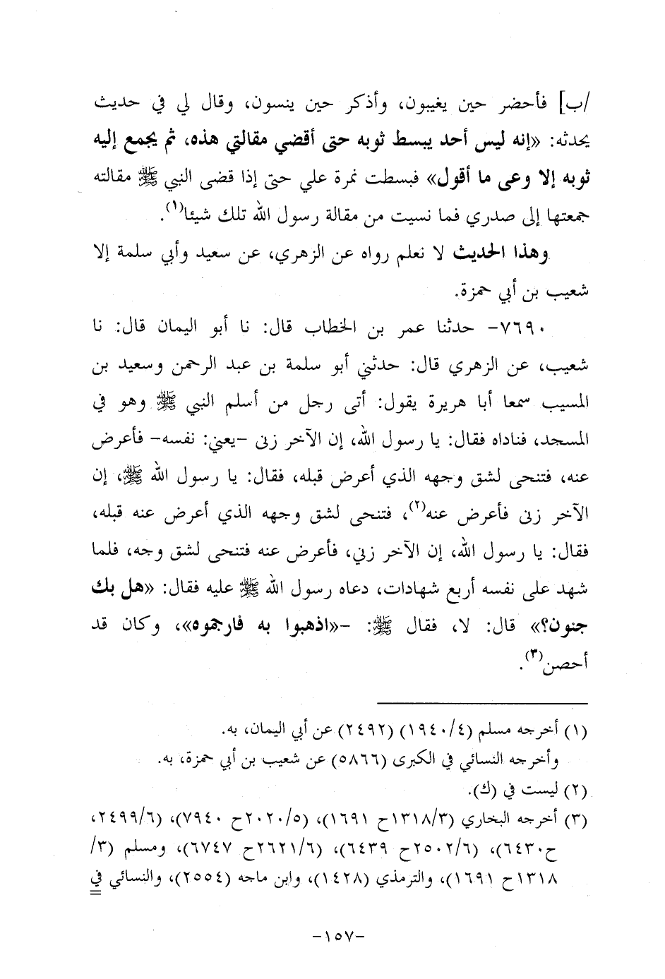 7690- حَدَّثنا عُمَر بن الخطاب، قَال: حَدَّثنا أَبُو اليمان، قَال: حَدَّثنا شعيب، عَن الزُّهْرِيّ قال: حدثني أَبُو سلمة بن عَبد الرحمن وسعيد بن الْمُسَيَّب سمعا أبا هُرَيرة يقول: أتى رجل من أسلم النَّبِيّ صَلَّى اللَّهُ عَلَيه وَسَلَّم، وهُو فِي المسجد فناداه فقال: يا رَسولَ اللهِ إن الآخر زنى - يعني نفسه - فأعرض عنه فتنحى لشق وجهه الذي أعرض قبله فقال: يا رسولَ اللهِ إن الآخر زنى فأعرض عنه فتنحى لشق وجهه الذي أعرض عنه قبله فقال: يا رَسولَ اللهِ إن الآخر زنى فأعرض عنه فتنحى لشق وجه فلما شهد على نفسه أربع شهادات دعاه رَسُولِ اللَّهِ صَلَّى اللَّهُ عَلَيه وَسَلَّم فَقَالَ: هل بك جنون؟ قال: لا، فقال صَلَّى الله عَلَيه وَسَلَّم: اذهبوا به فارجموه، وَكان قد أحصن.