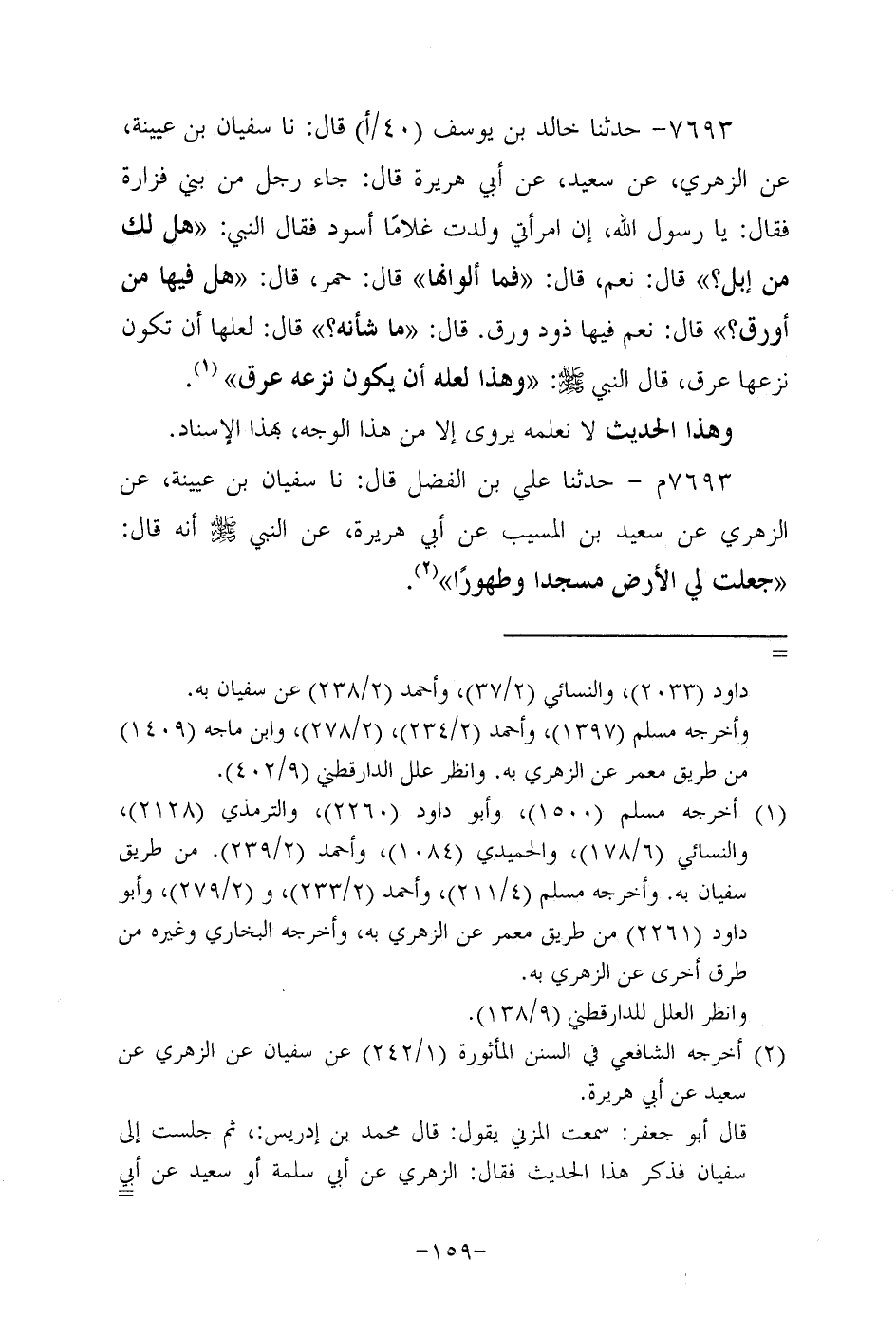 7693- حَدَّثنا خالد بن يوسف، قَال: حَدَّثنا سفيان بن عُيَينة، عَن الزُّهْرِيّ، عَن سَعِيد، عَن أبي هُرَيرة، قال: جاء رجل من بني فزارة فقال: يا رَسولَ اللهِ إن امرأتي ولدت غلاما أسود فقال النَّبِيّ: هل لك من إبل؟ قال: نعم قال: فما ألوانها قال: حمر قال: هل فيها من أورق؟ قال: نعم فيها ذود ورق. قال: ما شأنه؟ قال: لعلها أن تكون نزعها عِرْقٌ قال النَّبِيّ صَلَّى الله عَلَيه وَسَلَّم: وهذا لعله أن يكون نزعه عِرْقٌ.