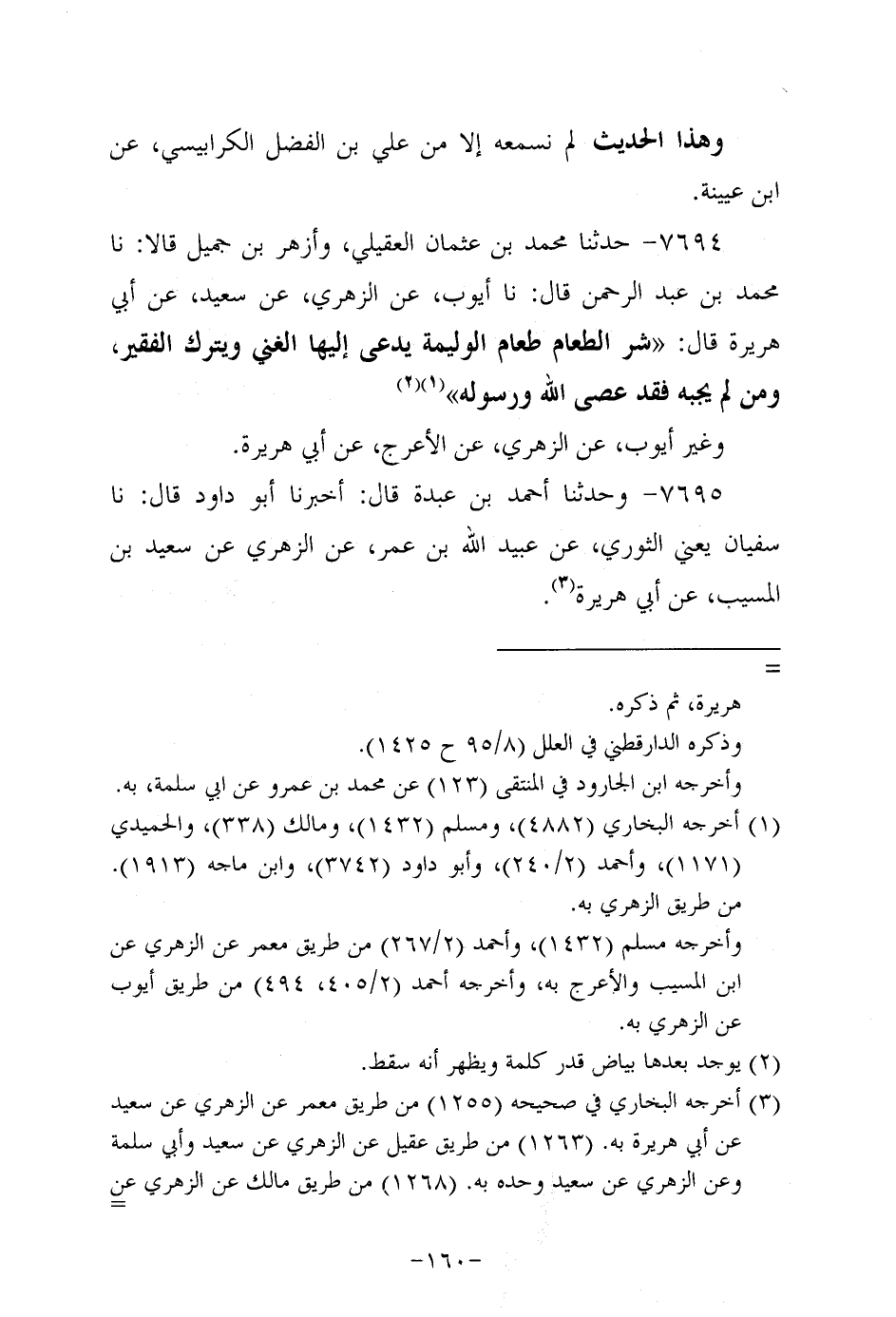 7694- حَدَّثنا مُحَمد بن عثمان العقيلي وأزهر بن جميل، قالاَ: حَدَّثنا مُحَمد بن عبد الرحمن، قَال: حَدَّثنا أيوب، عَن الزُّهْرِيّ، عَن سَعِيد، عَن أبي هُرَيرة، قال: شر الطعام طعام الوليمة , يدعى إليها الغني ويترك الفقير، وَمَنْ لم يجبه فقد عصى الله ورسوله.