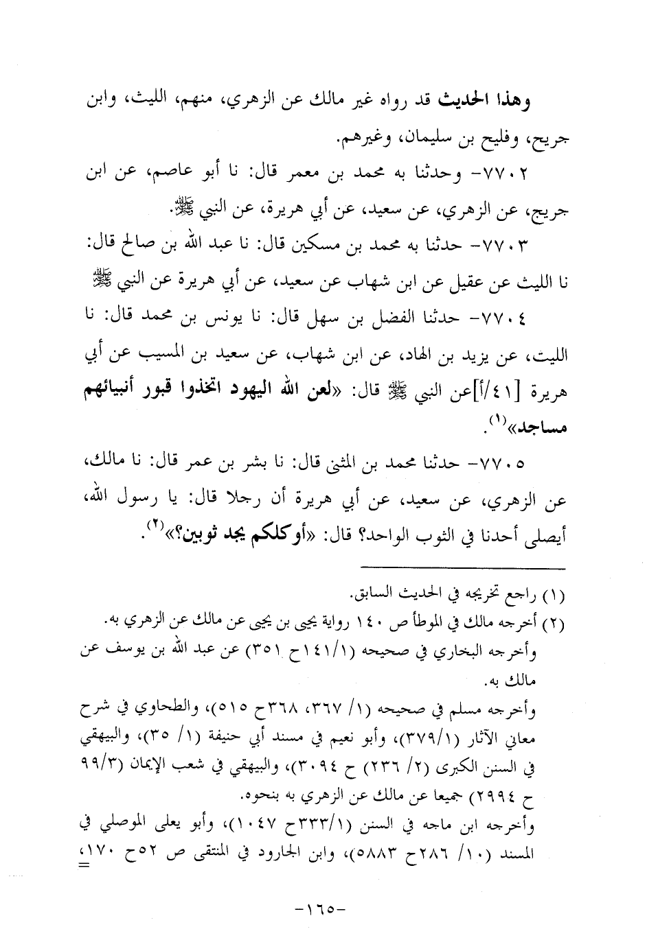 7704- حَدَّثنا الفضل بن سَهْل، قَال: حَدَّثنا يُونُس بن مُحَمد، قَال: حَدَّثنا اللَّيْث عن يزيد بن الهاد، عَن ابن شِهاب، عَن سَعِيد بن الْمُسَيَّب، عَن أَبِي هُرَيرة، عَن النَّبِيّ صَلَّى اللَّهُ عَلَيه وَسَلَّم قال: لعن الله اليهود اتخذوا قبور أنبيائهم مساجد.