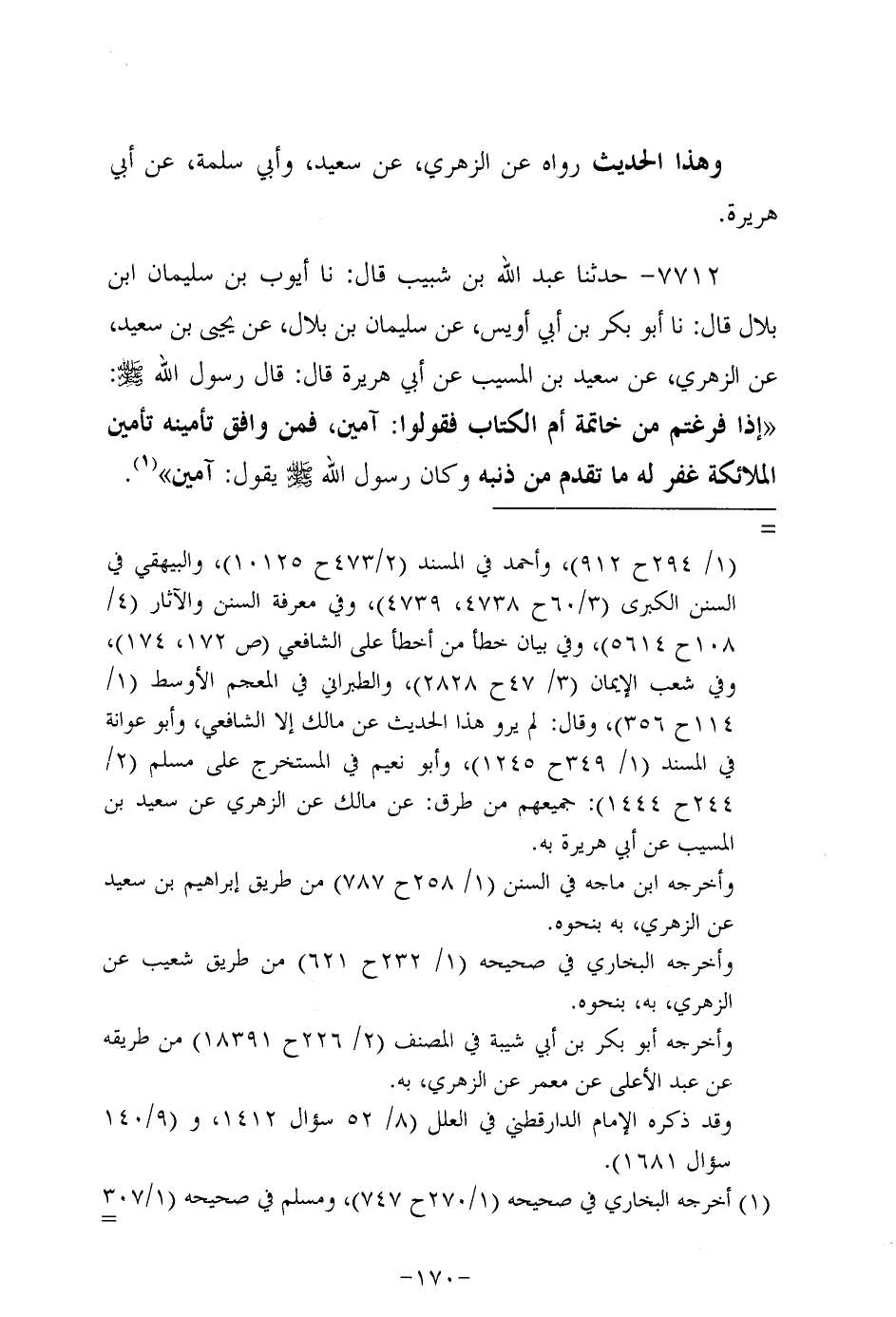 7712- حَدَّثنا عَبد الله بن شَبِيب، قَال: حَدَّثنا أيوب بن سُلَيْمان بن بلال، قَال: حَدَّثنا أَبْو بَكْر بْنِ أَبِي أُوَيْسٍ، عَن سُليمان بْنِ بِلالٍ، عَن يَحْيَى بْنِ سَعِيد، عَن الزُّهْرِيّ، عَن سَعِيد بن الْمُسَيَّب، عَن أبي هُرَيرة، قَالَ: قَالَ رَسُول اللهِ صَلَّى اللَّهُ عَلَيه وَسَلَّم: إذا فرغتم من خاتمة أم الكتاب فقولوا: آمين فمن وافق تأمينه تأمين الملائكة غفر له ما تقدم من ذنبه، وَكان رَسُولُ اللَّهِ صَلَّى اللَّهُ عَلَيه وَسَلَّم يقول: آمين.