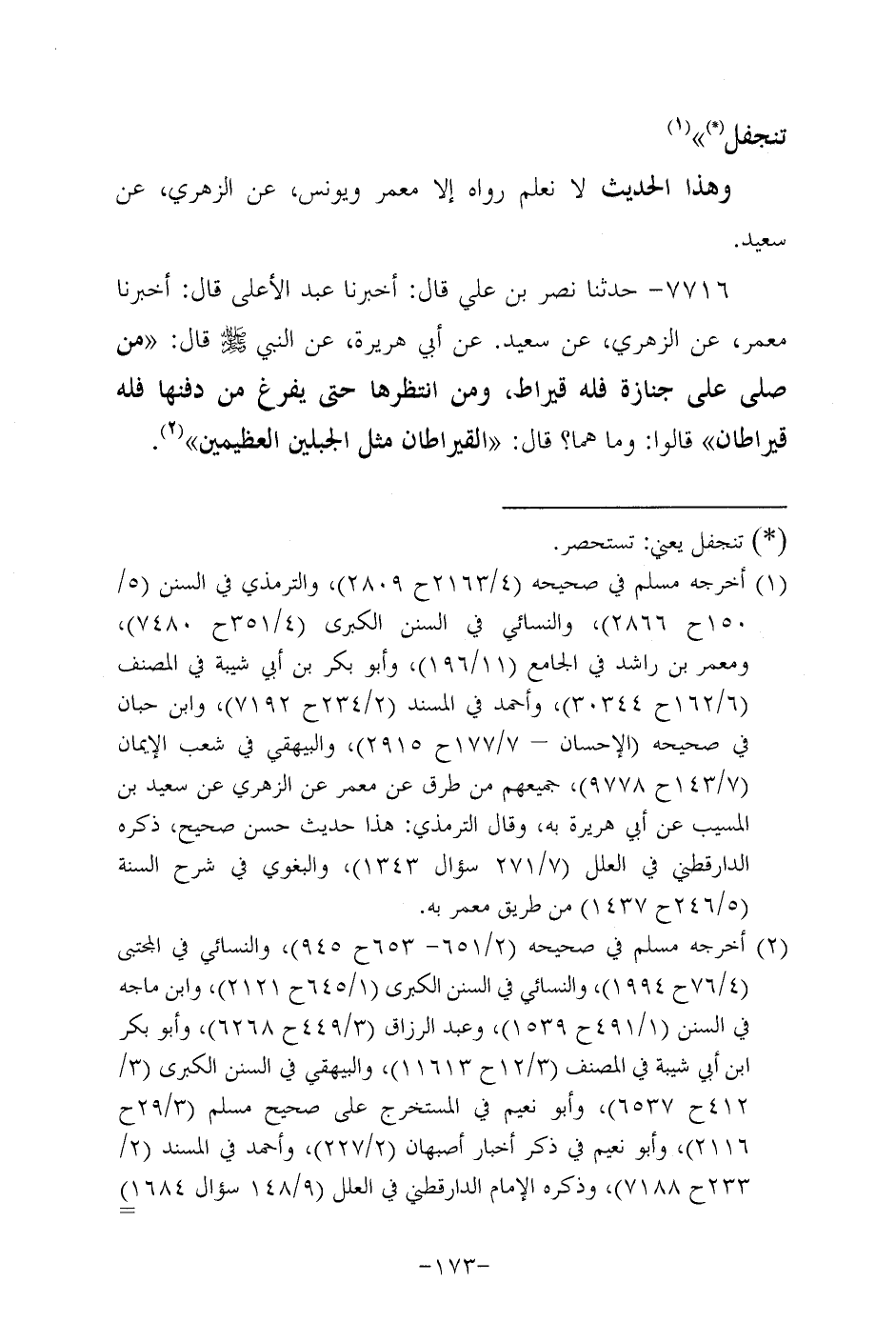 7716- حَدَّثنا نَصْرُ بْنُ عَلِيٍّ، قال: أَخْبَرنا عَبد الأعلى، قال: أَخْبَرنا مَعْمَر، عَن الزُّهْرِيّ، عَن سَعِيد، عَن أَبِي هُرَيرة، عَن النَّبِيّ صَلَّى اللَّهُ عَلَيه وَسَلَّم قَالَ: مَنْ صَلَّى عَلَى جَنَازَةٍ فله قيراط، وَمَنْ انتظرها حتى يفرغ من دفنها فله قيراطان قالوا: وما هما؟ قال: القيراطان مثل الجبلين العظيمين.
