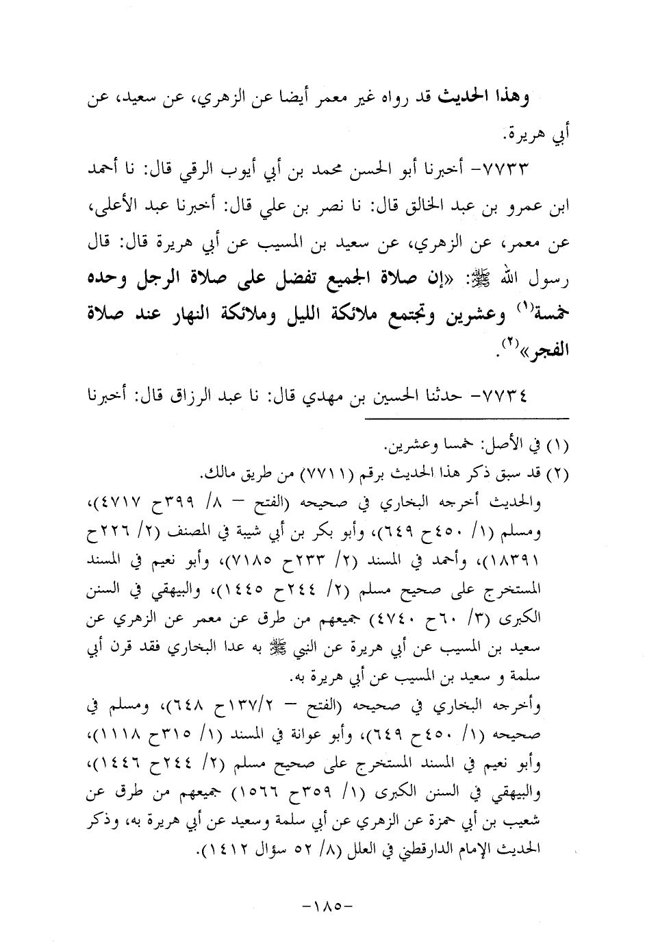 7733- أخبرنا أَبُو الحسن مُحَمد بن أبي أيوب الرقي، قَال: حَدَّثنا أَحْمَدُ بْنُ عَمْرو بْنِ عَبد الْخَالِقِ، قَال: حَدَّثنا نصر بن علي، قال: أَخْبَرنا عَبد الأعلى عن مَعْمَر، عَن الزُّهْرِيّ، عَن سَعِيد بن الْمُسَيَّب، عَن أبي هُرَيرة، قَالَ: قَالَ رَسُول اللهِ صَلَّى اللَّهُ عَلَيه وَسَلَّم: إن صلاة الجميع تفضل على صلاة الرجل وحده خمسة وعشرين وتجتمع ملائكة الليل وملائكة النهار عند صلاة الفجر.