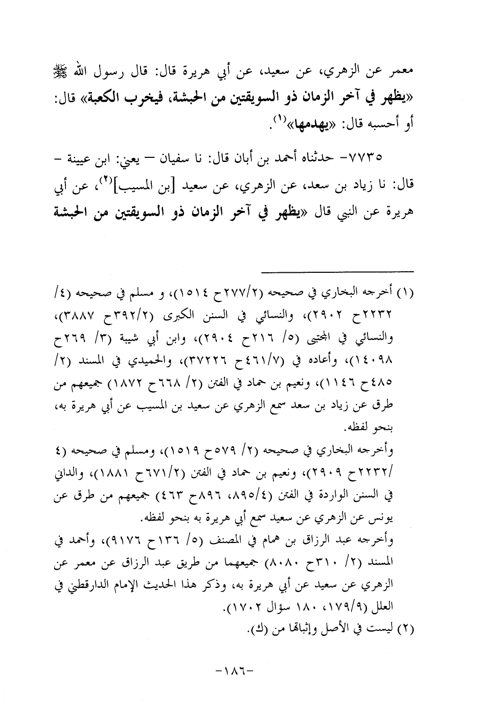 7735- حَدَّثناه أحمد بن أَبَان، قَال: حَدَّثَنا سُفْيَانُ، يعني ابن عُيَينة، قَال: حَدَّثنا زياد بن سَعْد، عَن الزُّهْرِيّ، عَن سَعِيد بن الْمُسَيَّب، عَن أَبِي هُرَيرة، عَن النَّبِيّ صَلَّى اللَّهُ عَلَيه وَسَلَّم قال: يظهر في آخر الزمان ذو السويقتين من الحبشة فيخرب الكعبة.