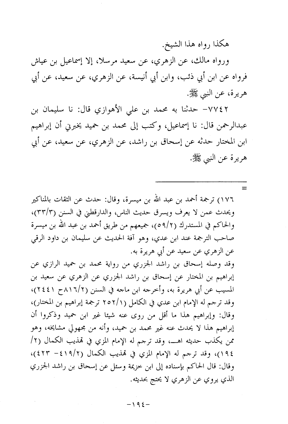 7742- حَدَّثنا به مُحَمد بن علي الأهوازي، قَال: حَدَّثنا سُلَيْمان بن عَبد الرحمن، قَال: حَدَّثنا إسماعيل وكتب إِلَيَّ مُحَمد بن حُمَيد يخبرني أن إبراهيم بن المختار حدثه عن إسحاق بن راشد، عَن الزُّهْرِيّ، عَن سَعِيد، عَن أَبِي هُرَيرة، عَن النَّبِيّ صَلَّى اللَّهُ عَلَيه وَسَلَّم.