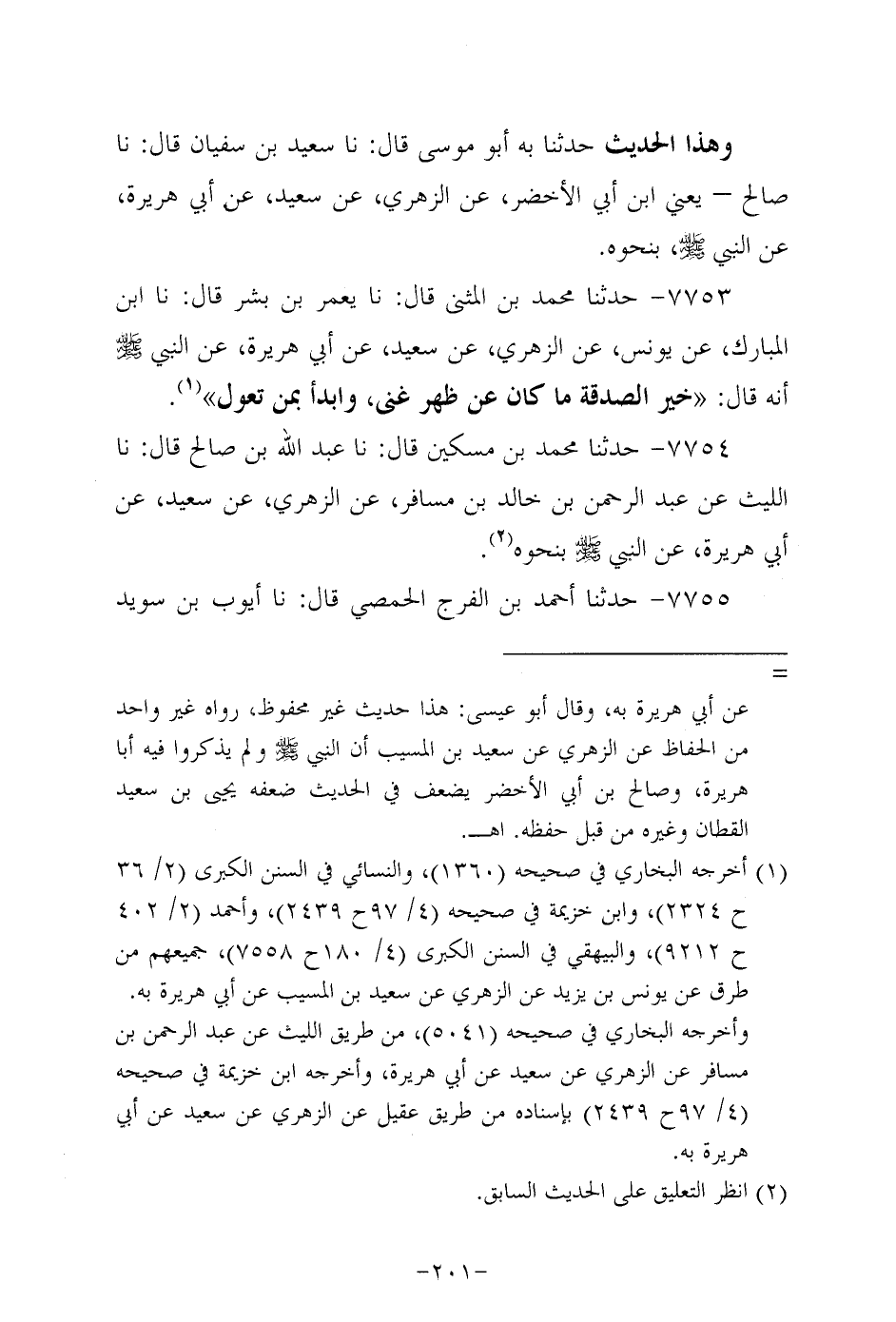 7753-حَدَّثَنا مُحَمَّدُ بْنُ الْمُثَنَّى، قَال: حَدَّثنا يعمر بن بشر، قَال: حَدَّثنا ابن المبارك عن يُونُس، عَن الزُّهْرِيّ، عَن سَعِيد، عَن أَبِي هُرَيرة، عَن النَّبِيّ صَلَّى اللَّهُ عَلَيه وَسَلَّم؛ أَنَّه قال: خير الصدقة ما كان عن ظهر غنى وابدأ بمن تعول.