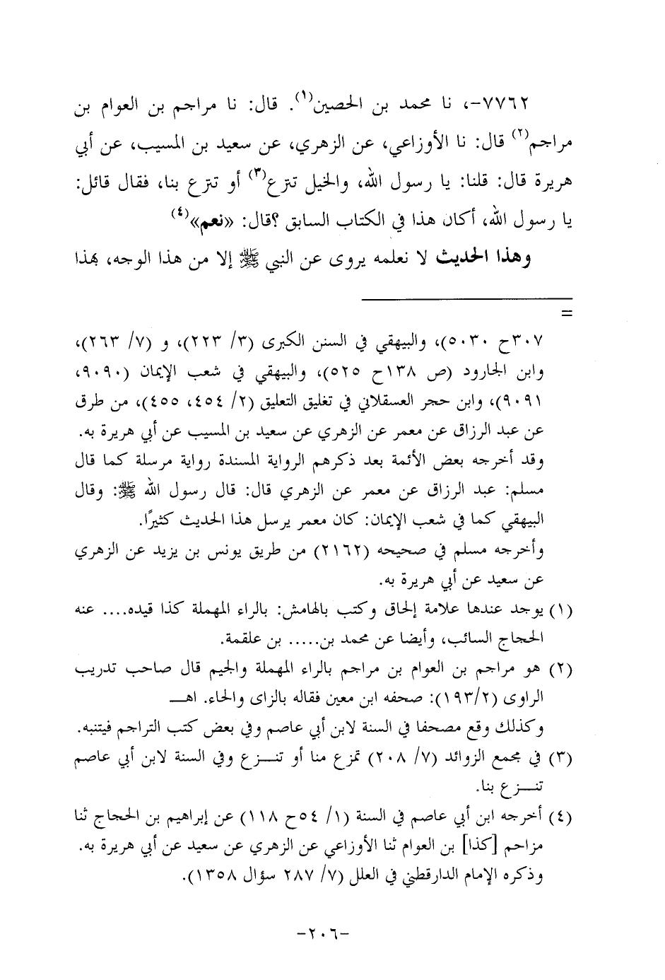 7762- حَدَّثنا مُحَمد بن الحصين، قَال: حَدَّثنا مراجم بن العوام بن مراجم، قَال: حَدَّثنا الأَوزَاعِيّ، عَن الزُّهْرِيّ، عَن سَعِيد بن الْمُسَيَّب، عَن أبي هُرَيرة، قال: قلنا: يا رَسولَ اللهِ والخيل تترع، أو تترع بنا فقال قائل: يا رَسولَ اللهِ , أكان هذا في الكتاب السابق؟ قَالَ: نَعَمْ.