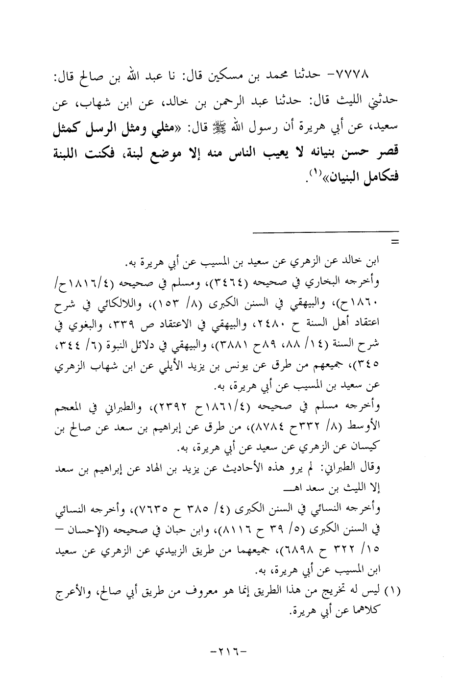 7778- حَدَّثنا مُحَمد بن مسكين، قَال: حَدَّثنا عَبد الله بن صالح قال: حدثني اللَّيْث، قَال: حَدَّثنا عَبد الرحمن بن خالد، عَن ابن شِهاب، عَن سَعِيد، عَن أبي هُرَيرة؛ أَنَّ رَسُولَ اللهِ صَلَّى اللَّهُ عَلَيه وَسَلَّم قال: مثلي ومثل الرسل كمثل قصر حسن بنيانه لا يعيب الناس منه إلاَّ موضع لبنة فكنت اللبنة فتكامل البنيان.