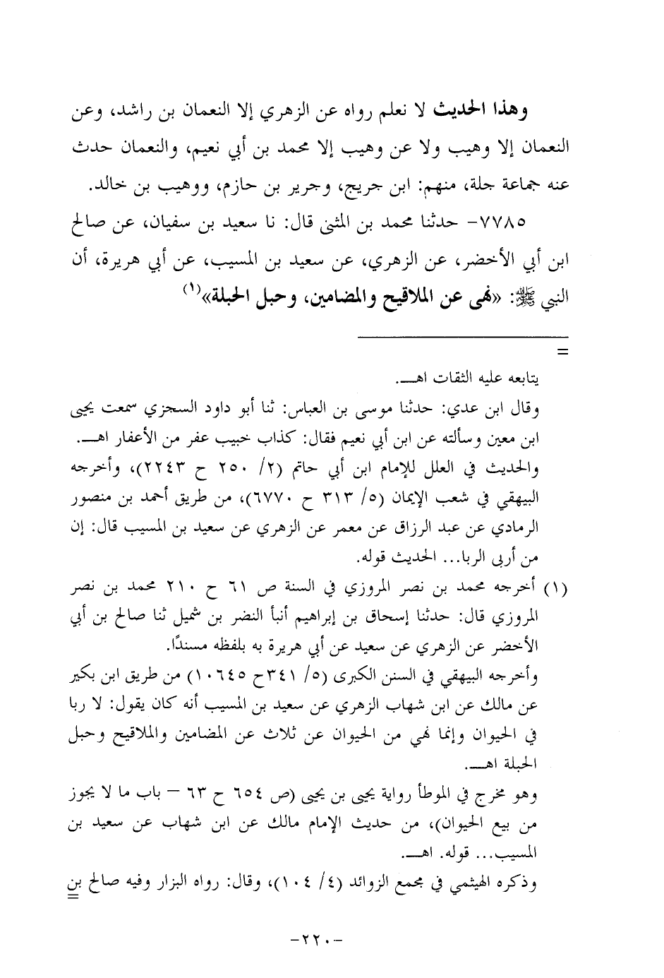 7785- حَدَّثَنا مُحَمَّدُ بْنُ الْمُثَنَّى، قَال: حَدَّثنا سَعِيد بن سُفيان، عَن صَالِحِ بْنِ أَبِي الأَخْضَرِ، عَن الزُّهْرِيّ، عَن سَعِيد بن الْمُسَيَّب، عَن أبي هُرَيرة؛ أَنَّ النَّبِيّ صَلَّى اللَّهُ عَلَيه وَسَلَّم: نَهَى عن الملاقيح والمضامين وحَبَل الحَبَلَة.