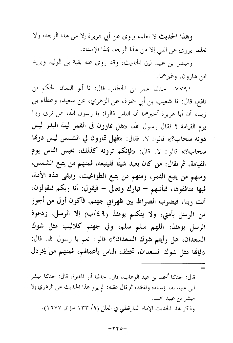 7791- حَدَّثنا عُمَر بن الخطاب، قَال: حَدَّثنا أَبُو اليمان الحكم بن نافع، قَال: حَدَّثنا شعيب بن أبي حمزة، عَن الزُّهْرِيّ، عَن سَعِيد وعطاء بن زيد أن أبا هُرَيرة أخبرهما أن الناس قالوا: يا رَسولَ اللهِ هل نرى ربنا يوم القيامة؟ فَقَالَ رَسُولُ اللَّهِ صَلَّى اللَّهُ عَلَيه وَسَلَّم: هل تمارون في القمر ليلة البدر ليس دونه سحاب؟ قالوا: لا. فقال هل تمارون في الشمس ليس دونها سحاب قالوا لا قال: فإنكم ترونه كذلك , يحبس الناس يوم القيامة، ثُمَّ يقال: من كان يعبد شيئا فليتبعه , فمنهم من يتبع الشمس , ومنهم من يتبع القمر , ومنهم من يتبع الطواغيت , وتبقى هذه الأمة فيها منافقوها.