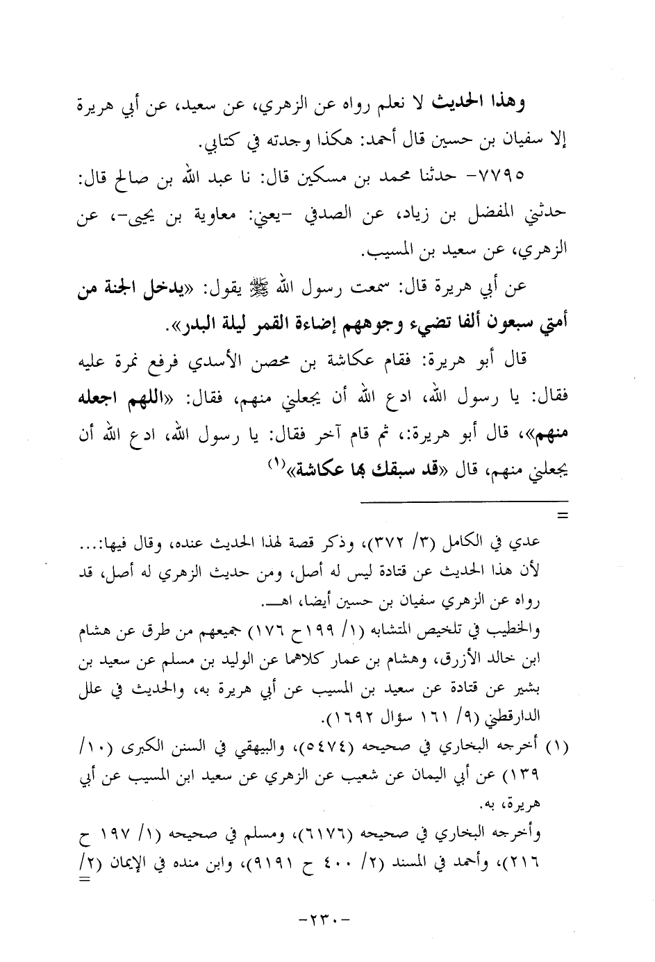 7795- حَدَّثنا مُحَمد بن مسكين، قَال: حَدَّثنا عَبد الله بن صالح قال: حدثني المفضل بن زياد عن الصدفي، يعني: معاوية بن يحيى، عَن الزُّهْرِيّ، عَن سَعِيد بن الْمُسَيَّب، عَن أبي هُرَيرة: سَمِعْتُ رَسُولَ اللَّهِ صَلَّى اللَّهُ عَلَيه وَسَلَّم يقول: يدخل الجنة من أمتي سبعون الفًا تضيء وجوههم إضاءة القمر ليلة البدر.