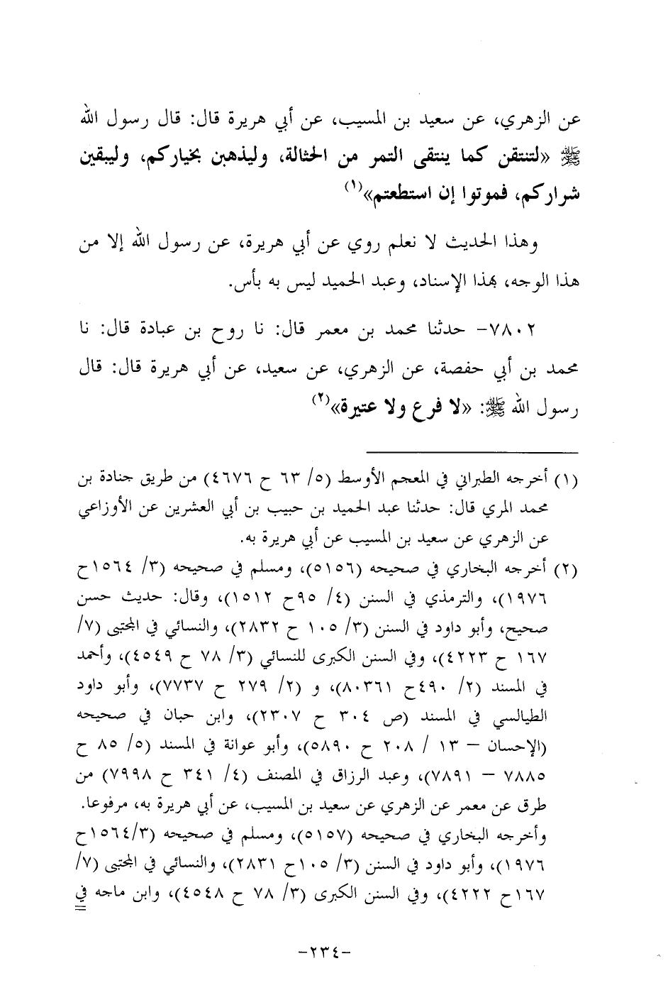 7802- حَدَّثنا مُحَمد بن مَعْمَر، قَال: حَدَّثنا روح بن عبادة، قَال: حَدَّثنا مُحَمد بْنُ أَبِي حَفْصَةَ، عَن الزُّهْرِيّ، عَن سَعِيد، عَن أبي هُرَيرة، قَالَ: قَالَ رَسُول اللهِ صَلَّى اللَّهُ عَلَيه وَسَلَّم: لا فرع، ولاَ عتيرة.