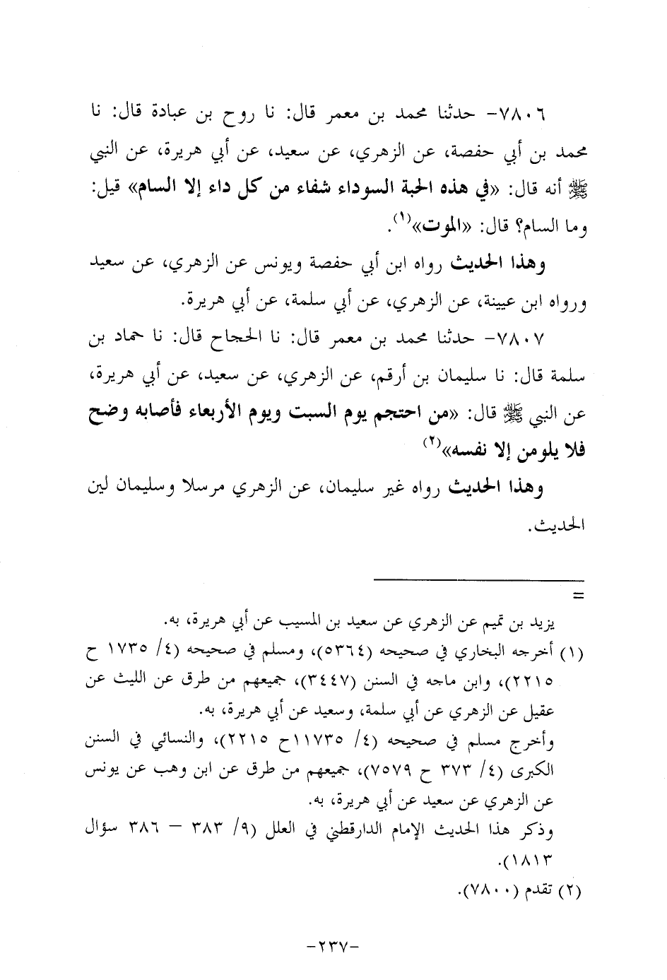 7806- حَدَّثنا مُحَمد بن مَعْمَر، قَال: حَدَّثنا روح بن عبادة، قَال: حَدَّثنا مُحَمد بْنُ أَبِي حَفْصَةَ، عَن الزُّهْرِيّ، عَن سَعِيد، عَن أَبِي هُرَيرة، عَن النَّبِيّ صَلَّى اللَّهُ عَلَيه وَسَلَّم؛ أَنَّه قال: في هذه الْحَبَّةَ السَّوْدَاءَ شِفَاءٌ مِنْ كُلِّ دَاءٍ إلاَّ السام قيل: وما السام؟ قال: الموت.