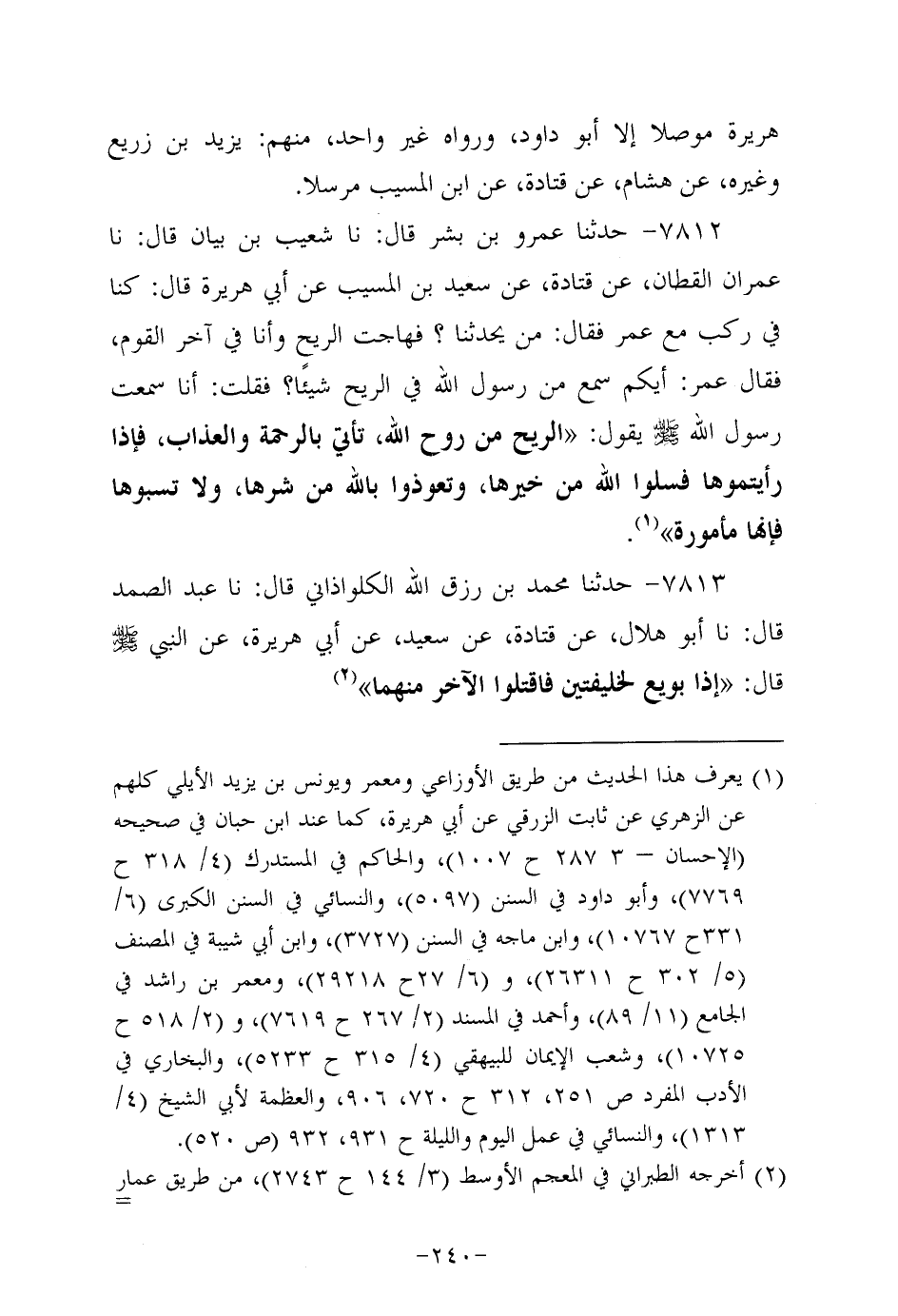 7812- حَدَّثنا عَمْرو بن بشر، قَال: حَدَّثنا شعيب بن بيان، قَال: حَدَّثنا عمران القطان، عَن قَتادة، عَن سَعِيد بن المسييب، عَن أبي هُرَيرة، قال: كُنَّا في ركب مع عُمَر فقال: من يحَدَّثنا؟ فهاجت الريح، وَأنا في آخر القوم فقال عُمَر: أيكم سمع مِنْ رَسُولِ اللَّهِ - صَلَّى اللَّهُ عَلَيْهِ وَسَلَّمَ - في الريح شيئا؟ فقلت: أنا سَمِعْتُ رَسُولَ اللَّهِ صَلَّى اللَّهُ عَلَيه وَسَلَّم يقول: الريح من روح الله تأتي بالرحمة والعذاب فإذا رأيتموها فسلوا الله من خيرها وتعوذوا بالله من شرها، ولاَ تسبوها فإنها مأمورة.