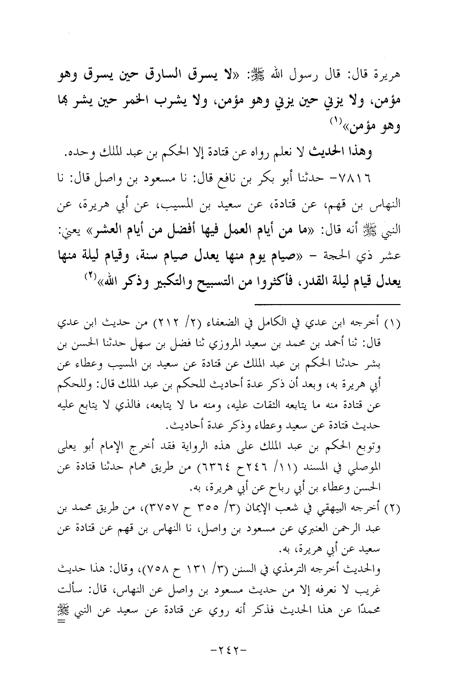 7816- حَدَّثنا أَبْو بَكْر بن نافع، قَال: حَدَّثنا مسعود بن واصل، قَال: حَدَّثنا النهاس بن قهم، عَن قَتادة، عَن سَعِيد بْنِ الْمُسَيَّب، عَن أَبِي هُرَيرة، عَن النَّبِيّ صَلَّى اللَّهُ عَلَيه وَسَلَّم؛ أَنَّه قال: ما من أيام العمل فيه أفضل من أيام العشر، يعني: عشر ذي الحجة - صيام يوم منها يعدل صيام سنة وقيام ليلة منها يعدل قيام ليلة القدر فأكثروا من التسبيح والتكبير وذكر اللَّهِ.