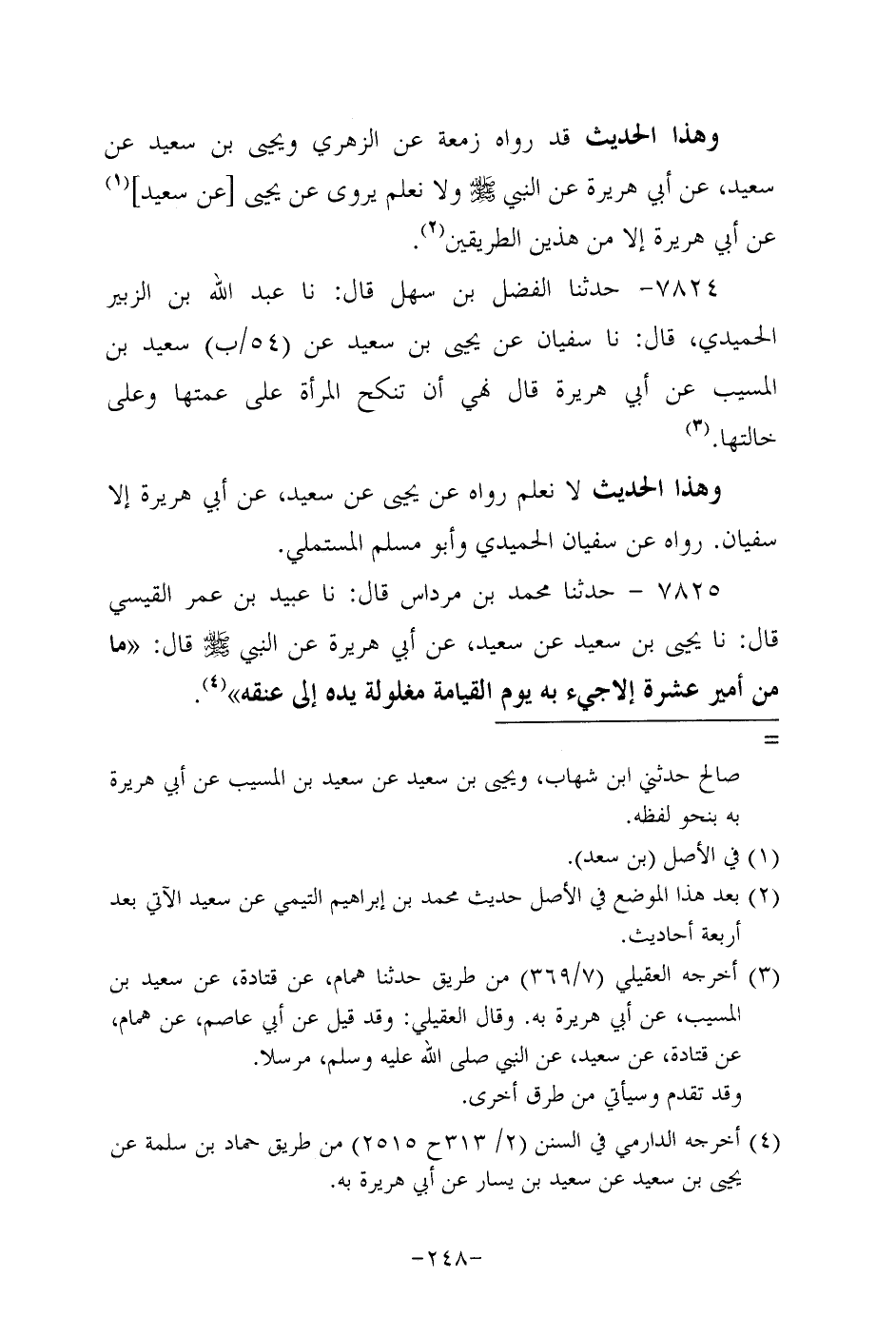 7824- حَدَّثنا الفضل بن سَهْل، قَال: حَدَّثنا عَبد الله بن الزبير الحميدي، قَال: حَدَّثنا سُفيان، عَن يحيى بن سَعِيد، عَن سَعِيد بن الْمُسَيَّب، عَن أبي هُرَيرة، قال نَهَى أَنْ تُنْكَحَ الْمَرْأَةُ عَلَى عَمَّتِهَا وَعَلَى خَالَتِهَا.