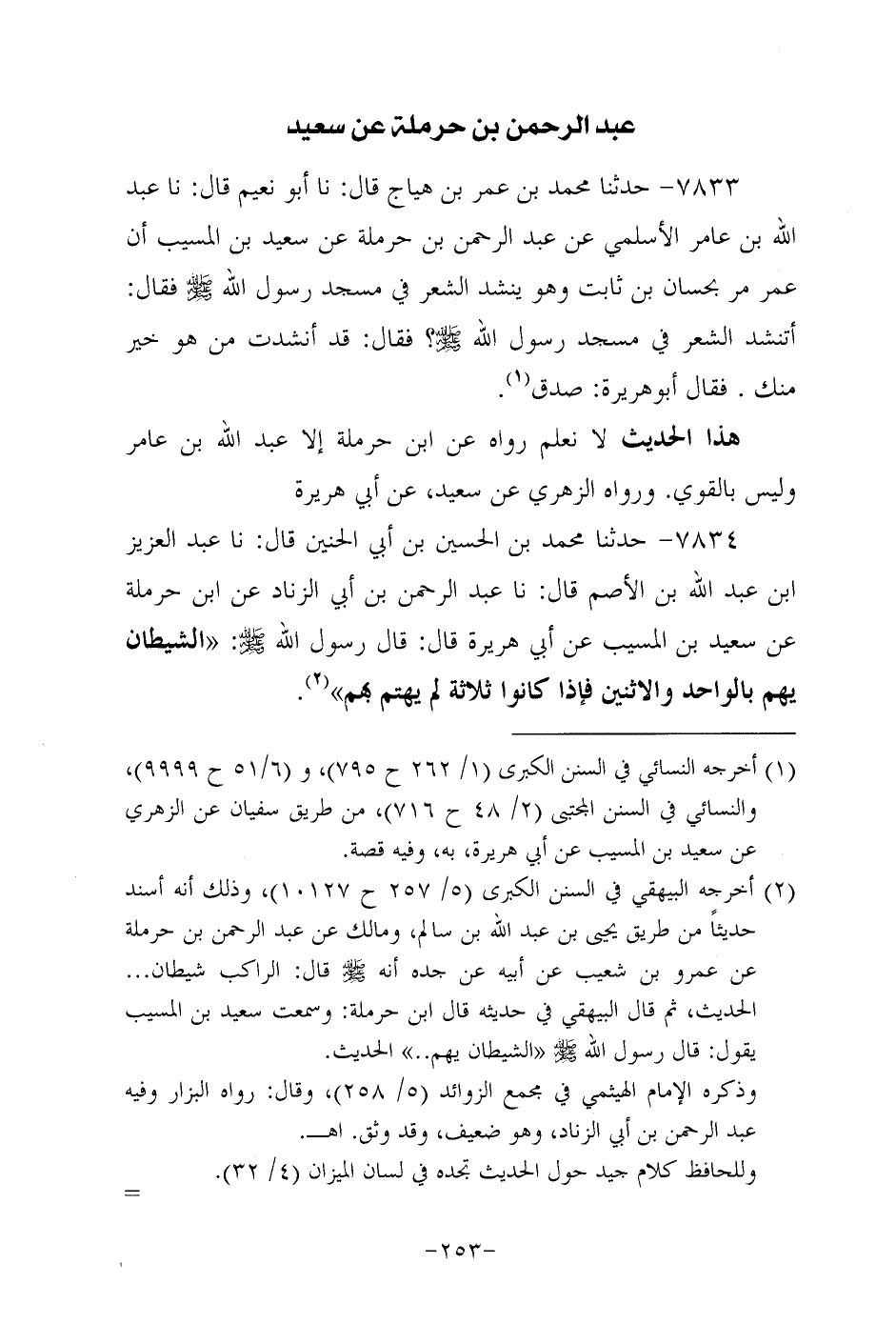 7833- حَدَّثنا مُحَمد بْنُ عُمَر بْنِ هَيَّاجٍ، قَال: حَدَّثنا أَبُو نعيم، قَال: حَدَّثنا عَبد الله بن عامر الأسلمي عن عَبد الرحمن بن حرملة، عَن سَعِيد بن الْمُسَيَّب أن عُمَر مر بحسان بن ثابت، وهُو ينشد الشعر فِي مَسْجِدِ رَسُولِ اللَّهِ صَلَّى اللَّهُ عَلَيه وَسَلَّم فقال: أتنشد الشعر فِي مَسْجِدِ رَسُولِ اللَّهِ صَلَّى اللَّهُ عَلَيه وَسَلَّم؟ فقال: قد أنشدت من هو خير منك. فقال أَبُو هُرَيرة: صدق.